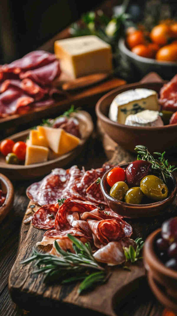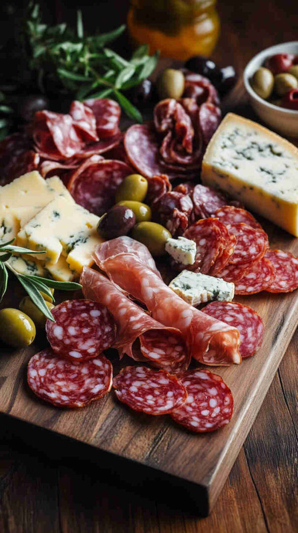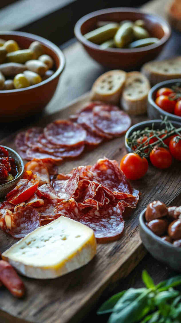 Let cheeses sit at room temperature for 20 minutes before serving so their flavors fully bloom and they slice easier. Buy deli meats thinly sliced and fold or roll them loosely to add height and make them easy to grab. Use small bowls or ramekins for wet items like olives and marinated vegetables to keep the board tidy and prevent flavors from mixing.