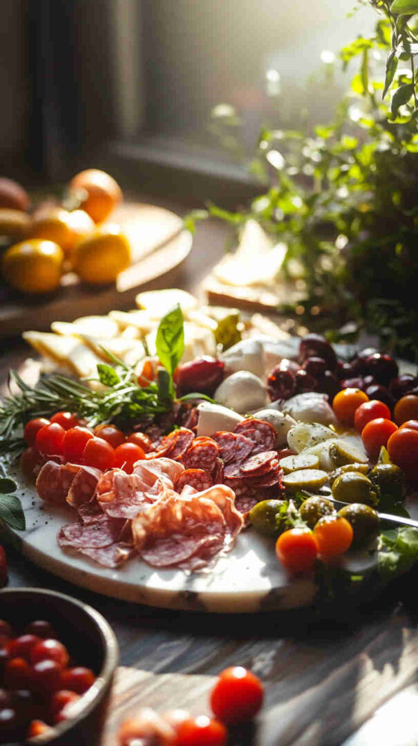 For low-carb guests, replace bread with sliced cucumber, endive leaves, and parmesan crisps. Kids usually prefer mild cheeses, mini mozzarella balls, and less spicy meats like mortadella. You can even theme it by color for holidays, using red tomatoes, white mozzarella, and green basil for Christmas.