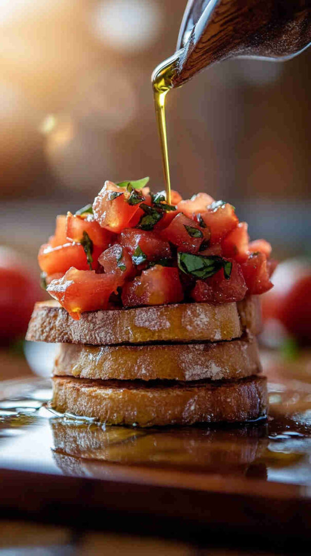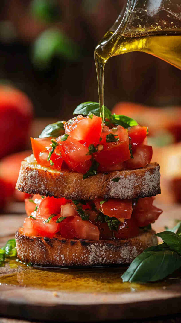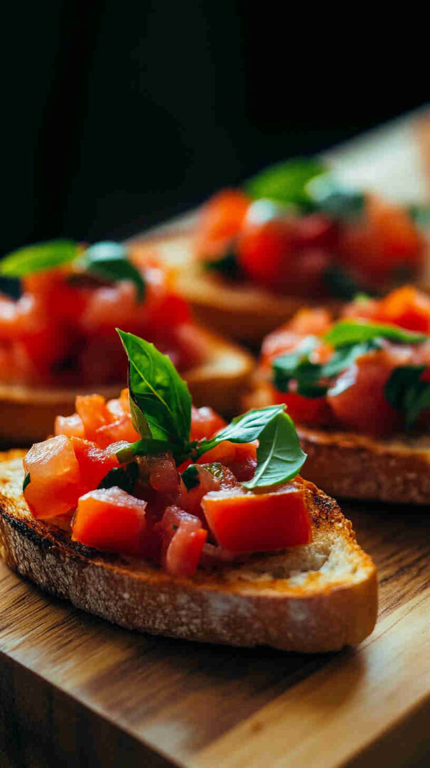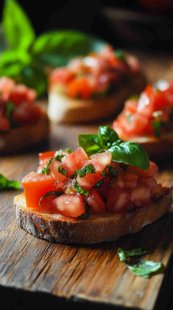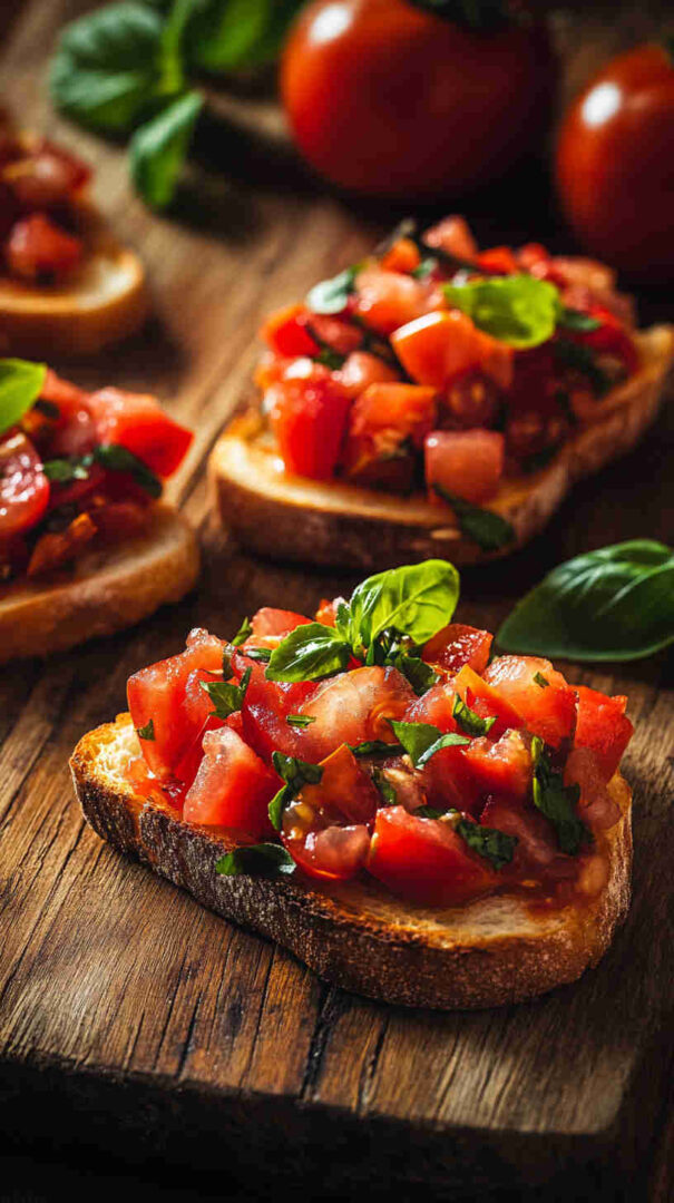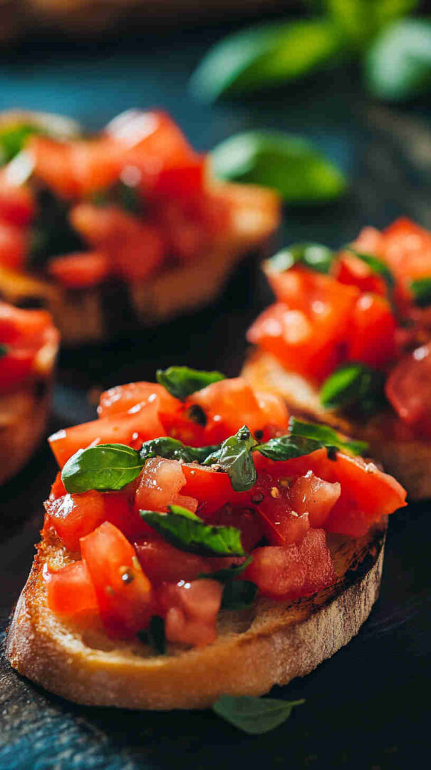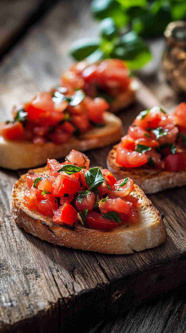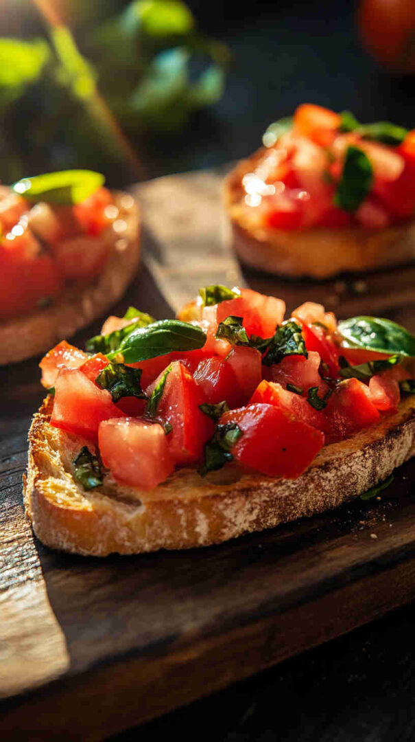 Authentic Italian bruschetta features grilled or toasted rustic bread rubbed with fresh garlic, drizzled with extra virgin olive oil, and topped with juicy diced tomatoes marinated in olive oil, basil, salt, and a hint of garlic. A refreshing, no-fuss appetizer that highlights summer’s best produce in every bright, flavorful bite.