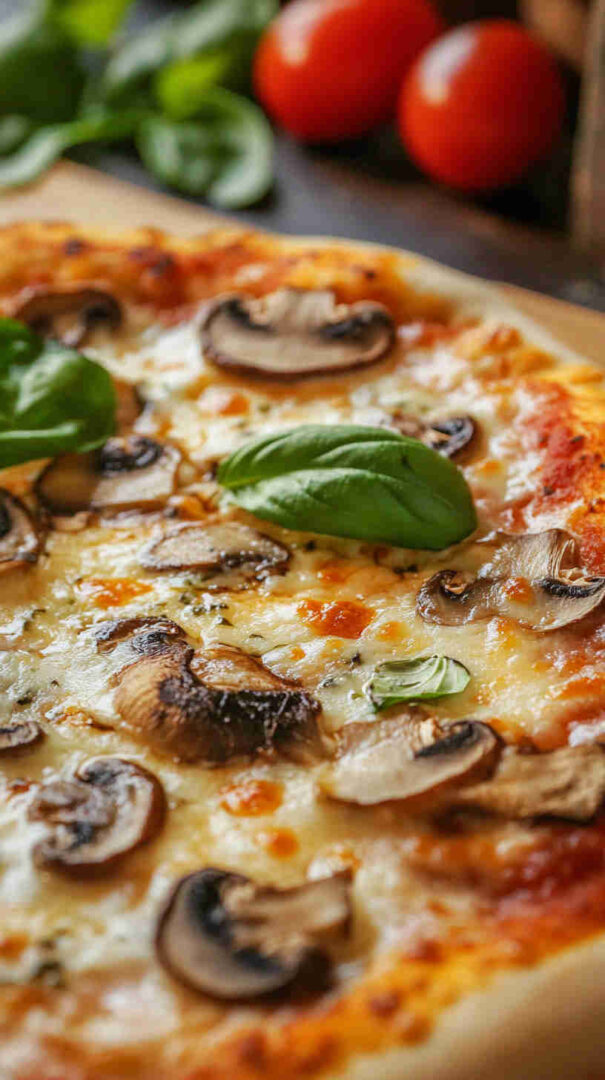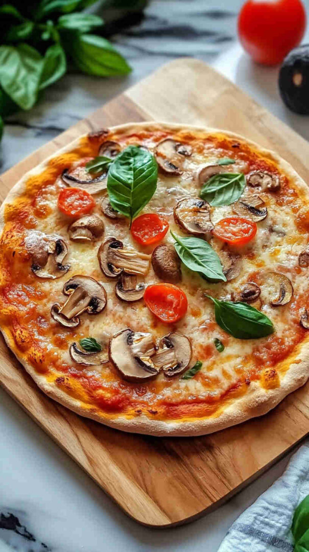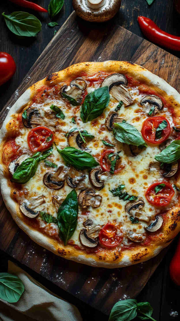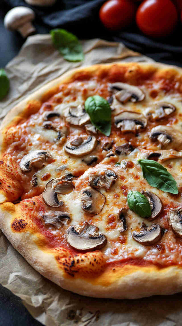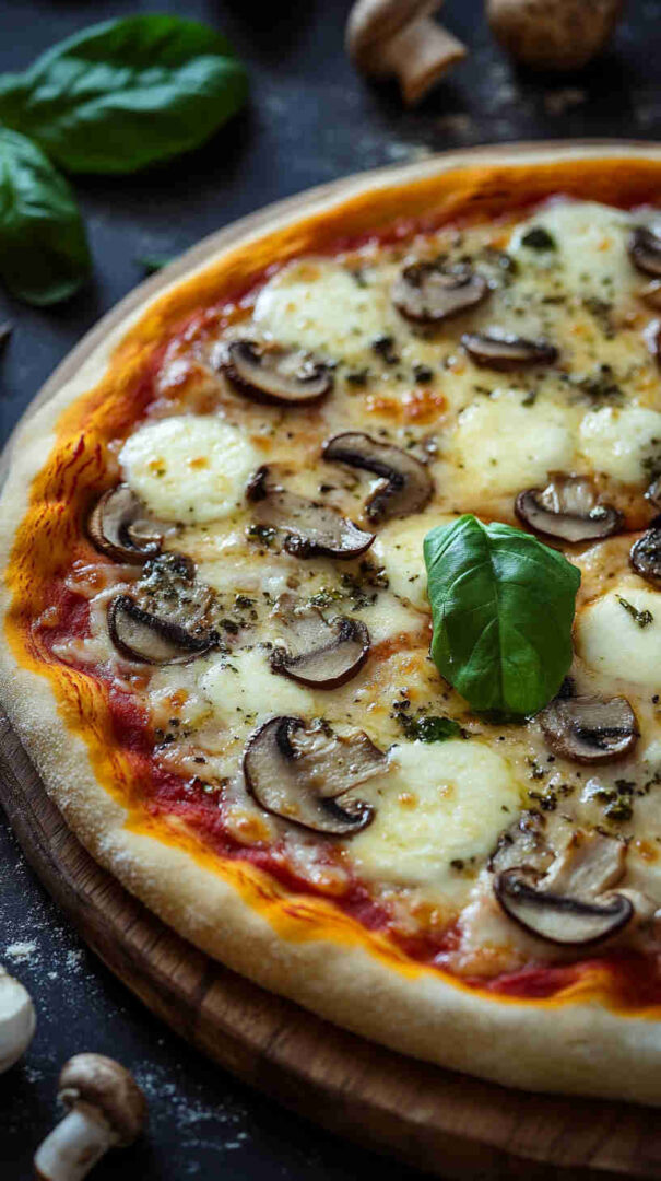 Classic Mushroom Margherita Pizza features a thin, crispy crust topped with vibrant tomato sauce, creamy fresh mozzarella, juicy sliced tomatoes, golden sautéed mushrooms, and fragrant fresh basil leaves. Finished with a drizzle of olive oil and a sprinkle of sea salt, it’s a simple yet elegant vegetarian pizza bursting with authentic Italian flavors and umami richness.