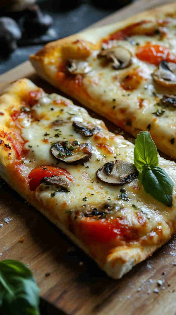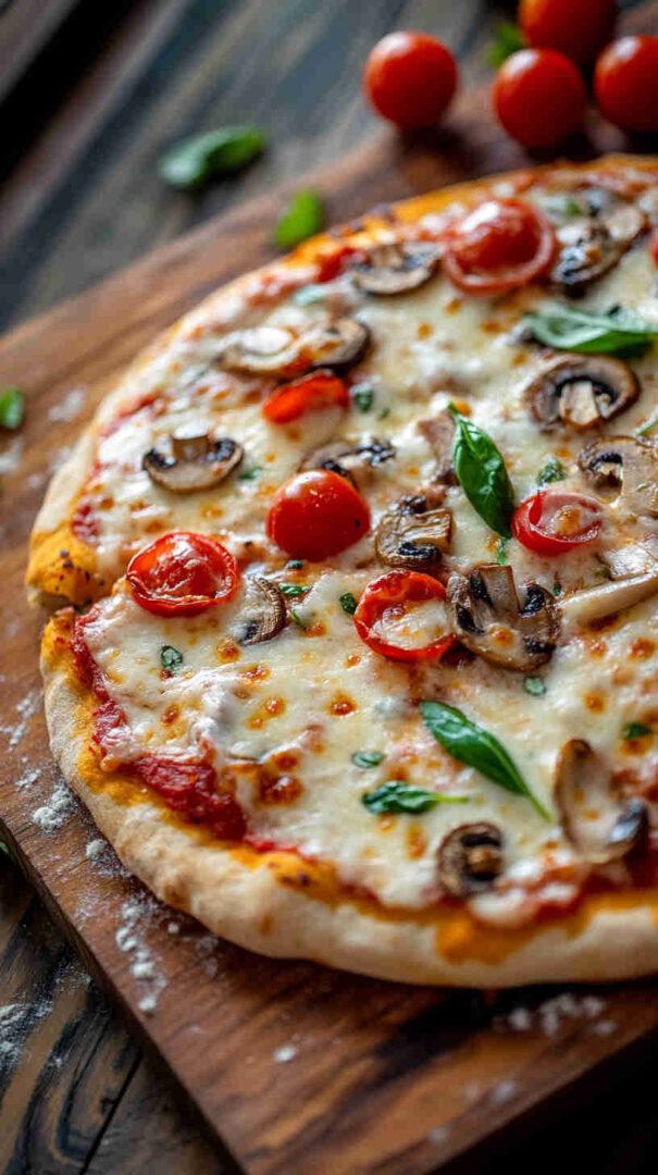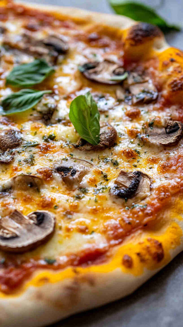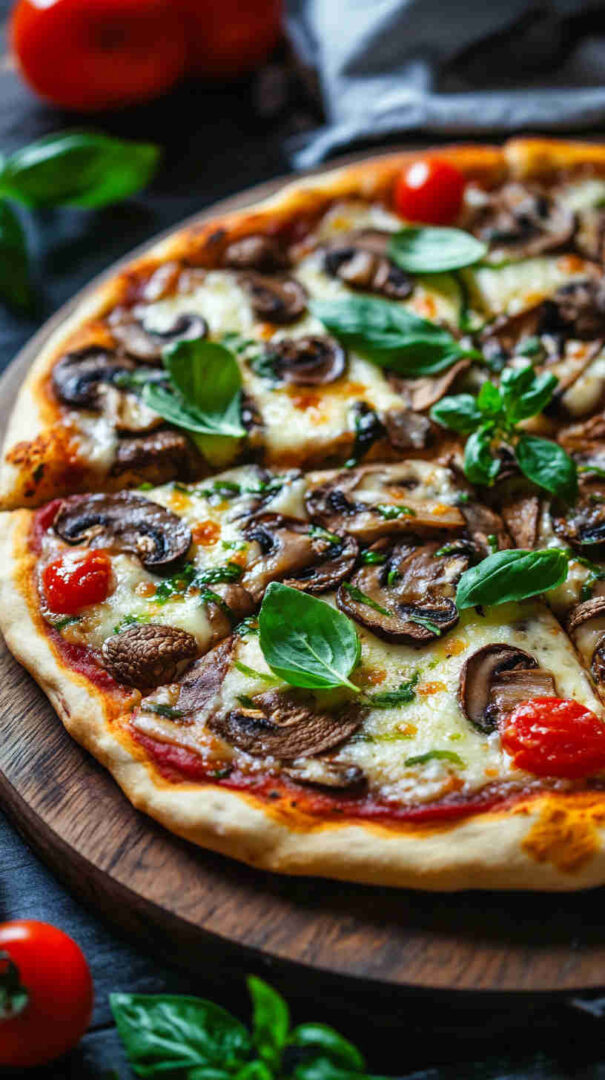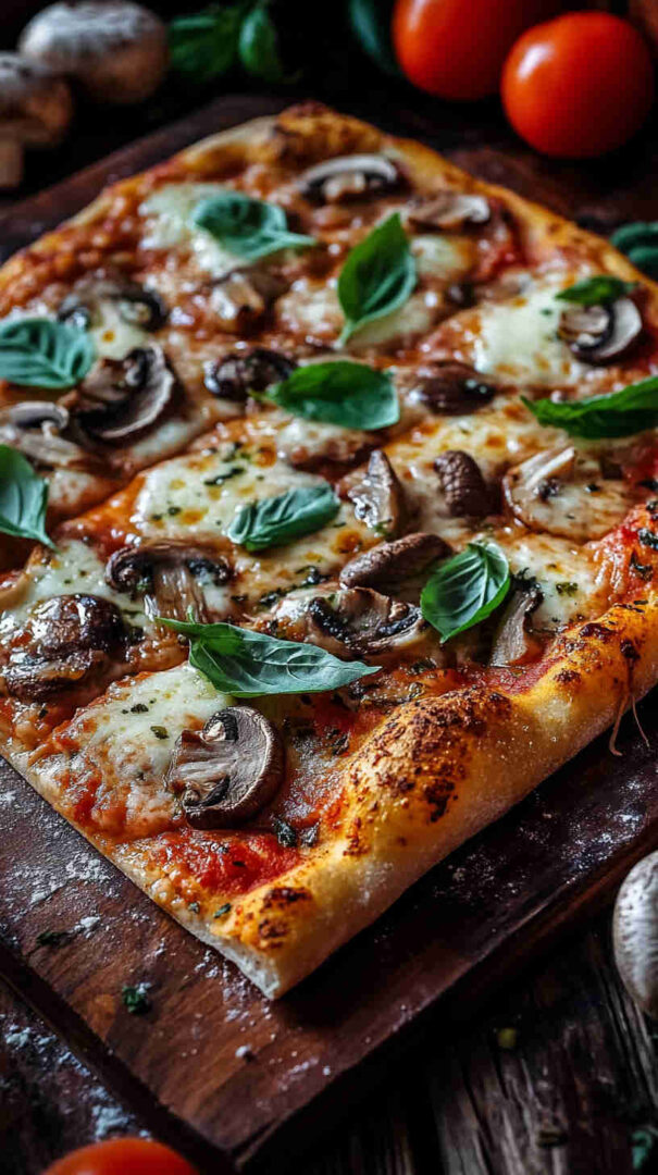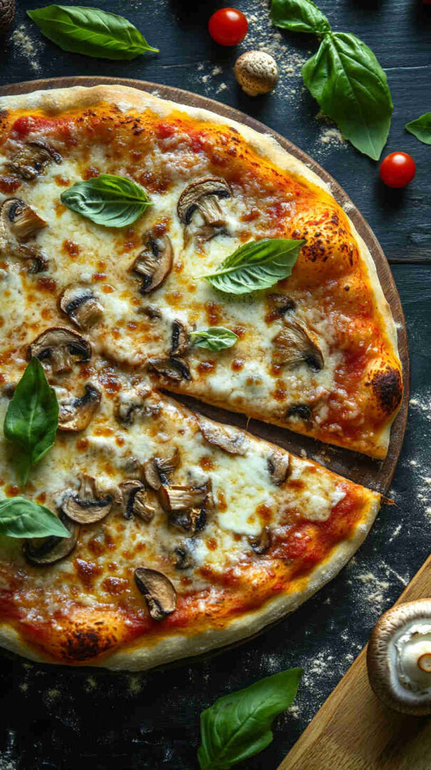 Classic Mushroom Margherita Pizza features a thin, crispy crust topped with vibrant tomato sauce, creamy fresh mozzarella, juicy sliced tomatoes, golden sautéed mushrooms, and fragrant fresh basil leaves. Finished with a drizzle of olive oil and a sprinkle of sea salt, it’s a simple yet elegant vegetarian pizza bursting with authentic Italian flavors and umami richness.