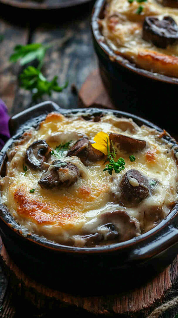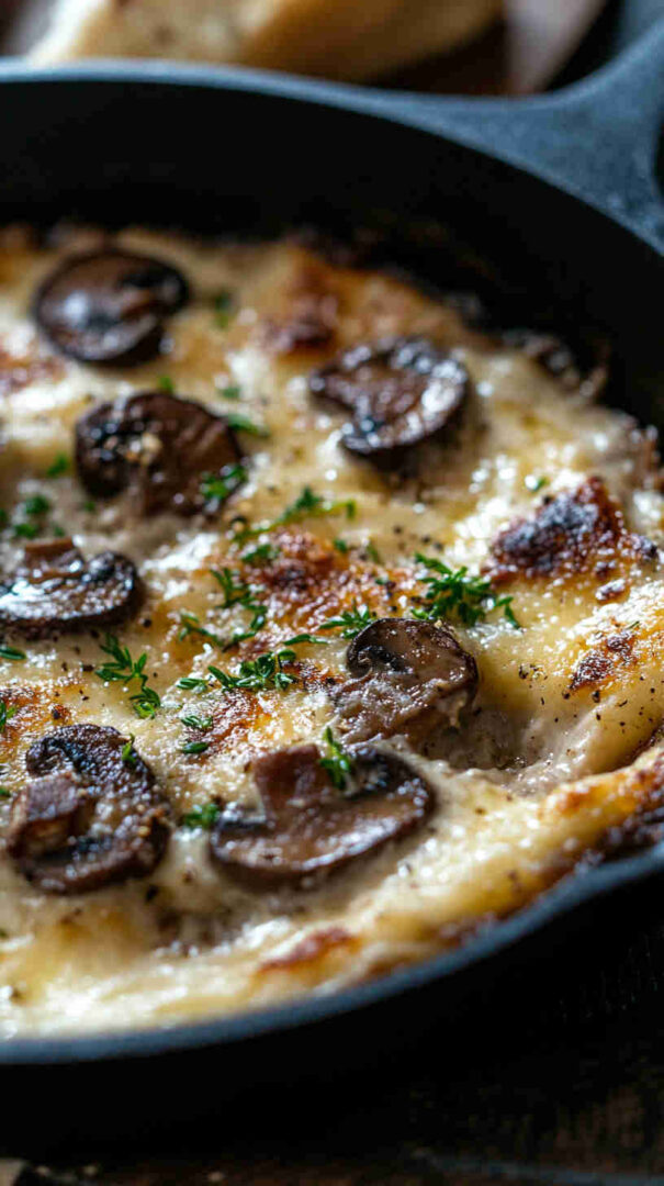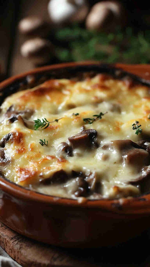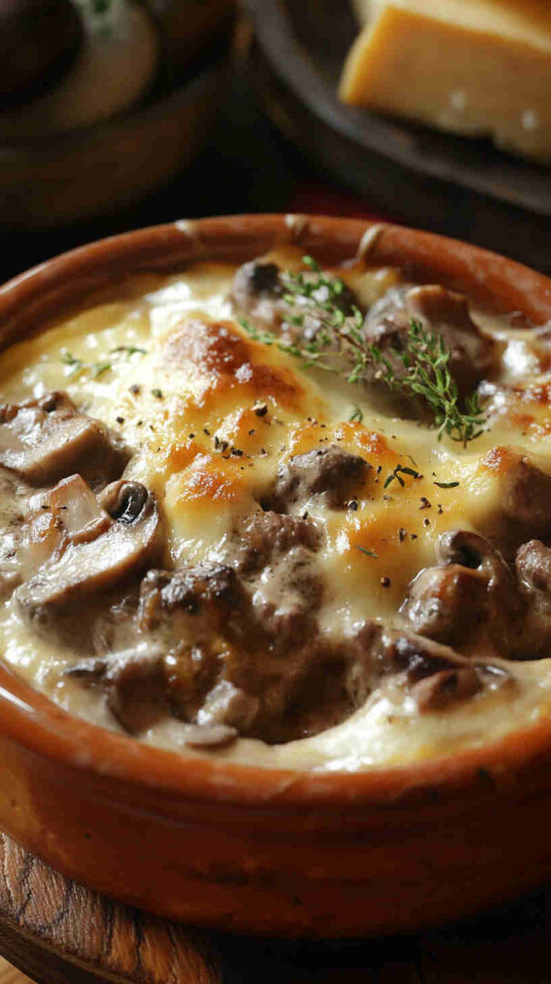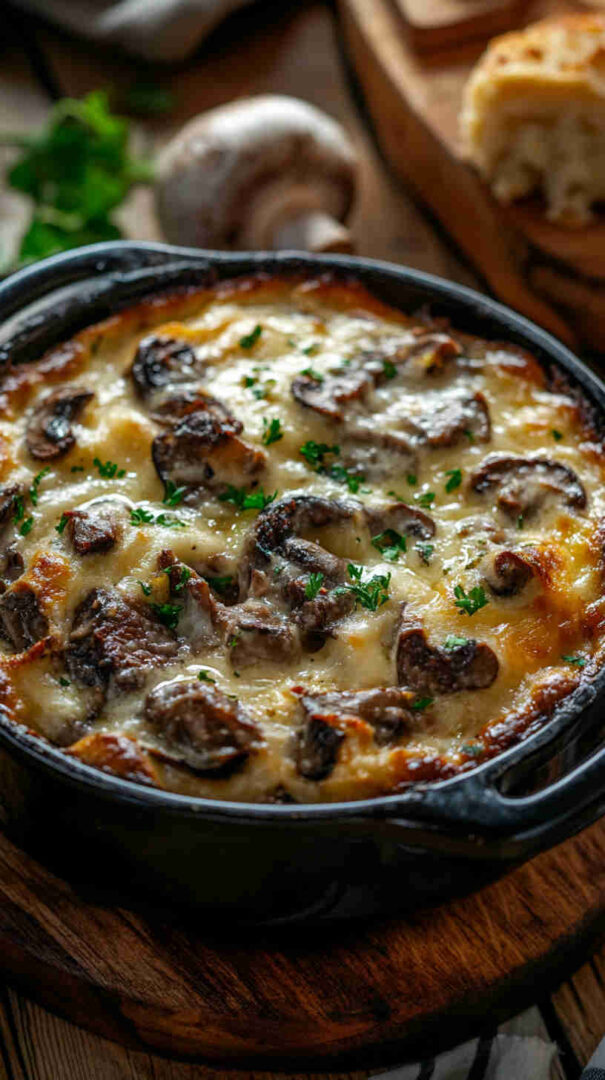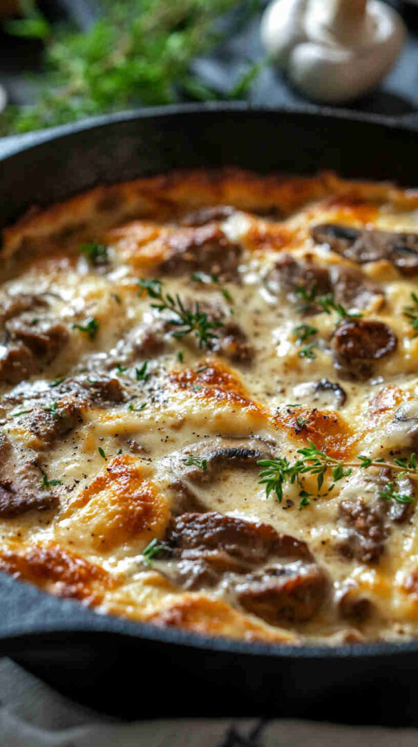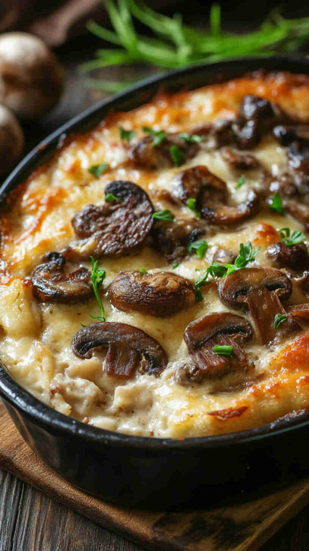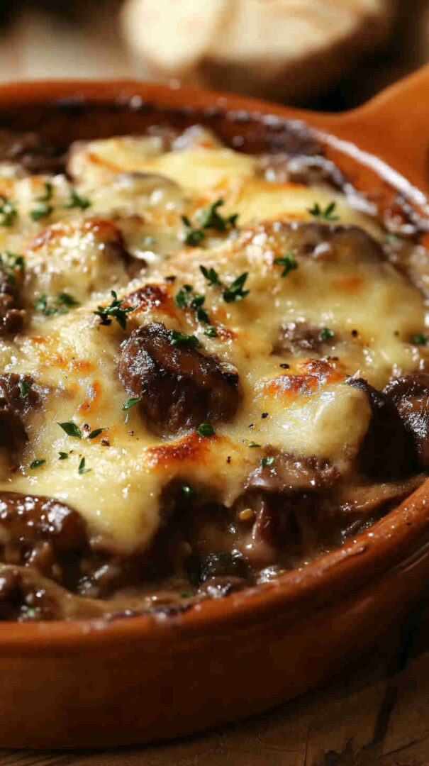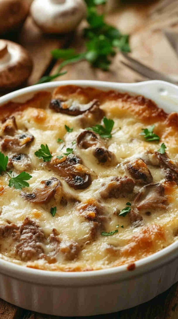 Hearty baked casserole with tender beef, mushrooms, and creamy garlic sauce, topped with melted cheese—pure comfort!