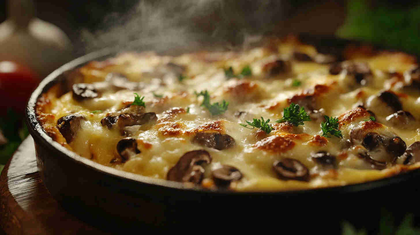 Hearty baked casserole with tender beef, mushrooms, and creamy garlic sauce, topped with melted cheese—pure comfort!
