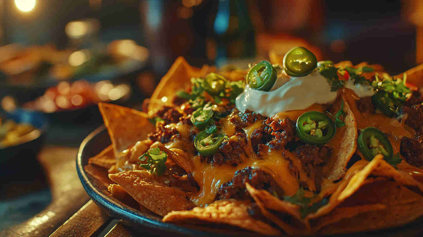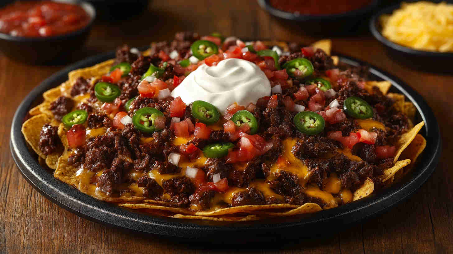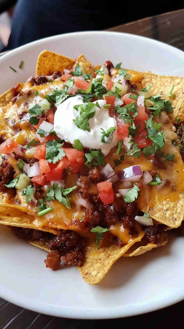 These irresistible crispy beef and cheddar nachos feature layers of golden tortilla chips topped with richly seasoned ground beef, gooey melted cheddar cheese, and fresh toppings like jalapeños, tomatoes, sour cream, and green onions. Baked until bubbly and crisp, they’re perfect for game days, parties, or indulgent movie nights with bold Tex-Mex flavor in every bite.