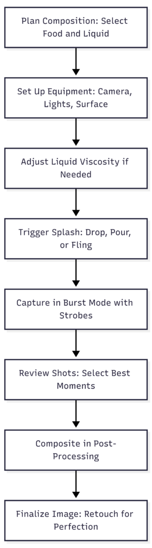 Alternatives like the pour effect simulate motion without full splashes, adding life to static dishes. Viscosity plays a role: thicker liquids (e.g., sauces) create slower, more defined shapes, while thinner ones (e.g., water) yield finer droplets.