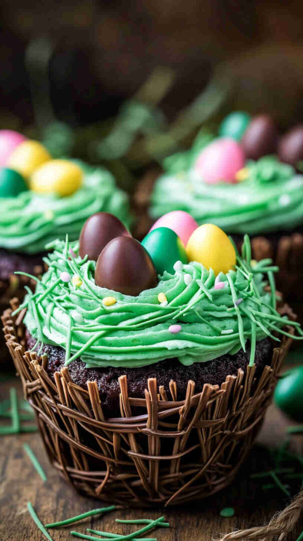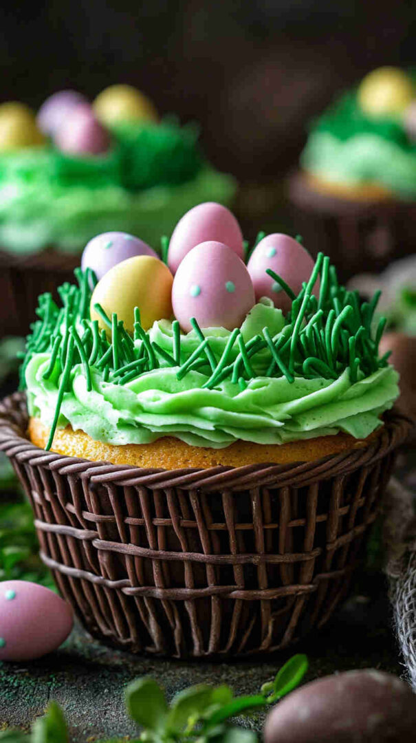 Fill “baskets” with Peeps, malted eggs, or even fresh berries for a lighter option. For adult gatherings, add a splash of rum or citrus liqueur to frosting. Mini cupcakes version halves bake time—great for bite-sized treats.