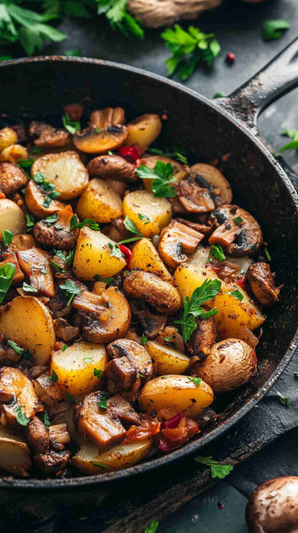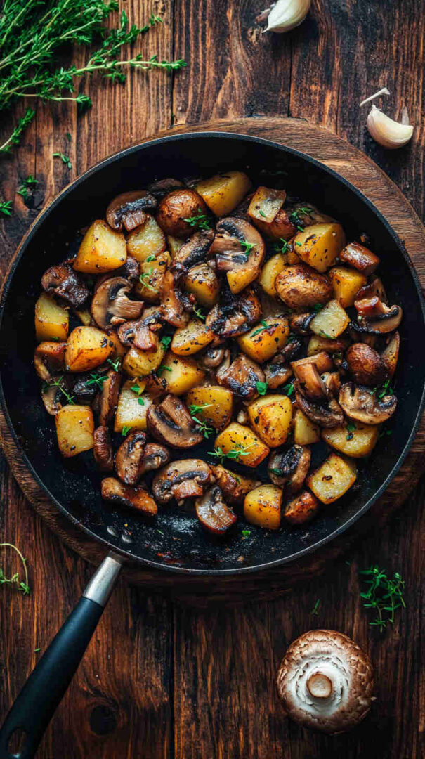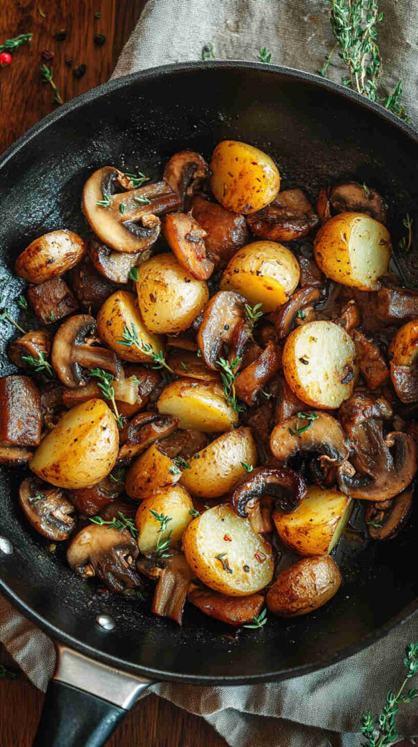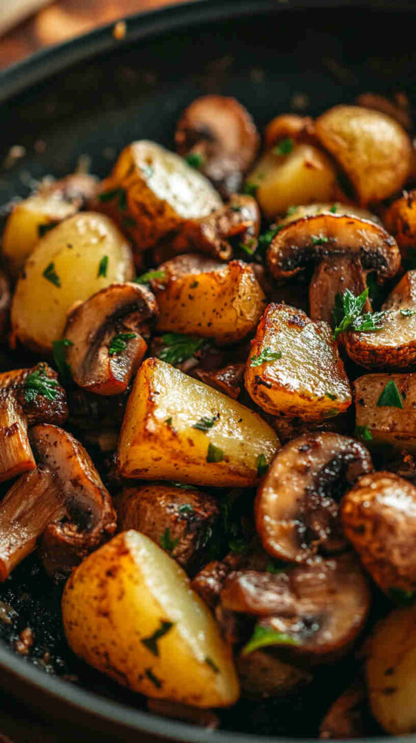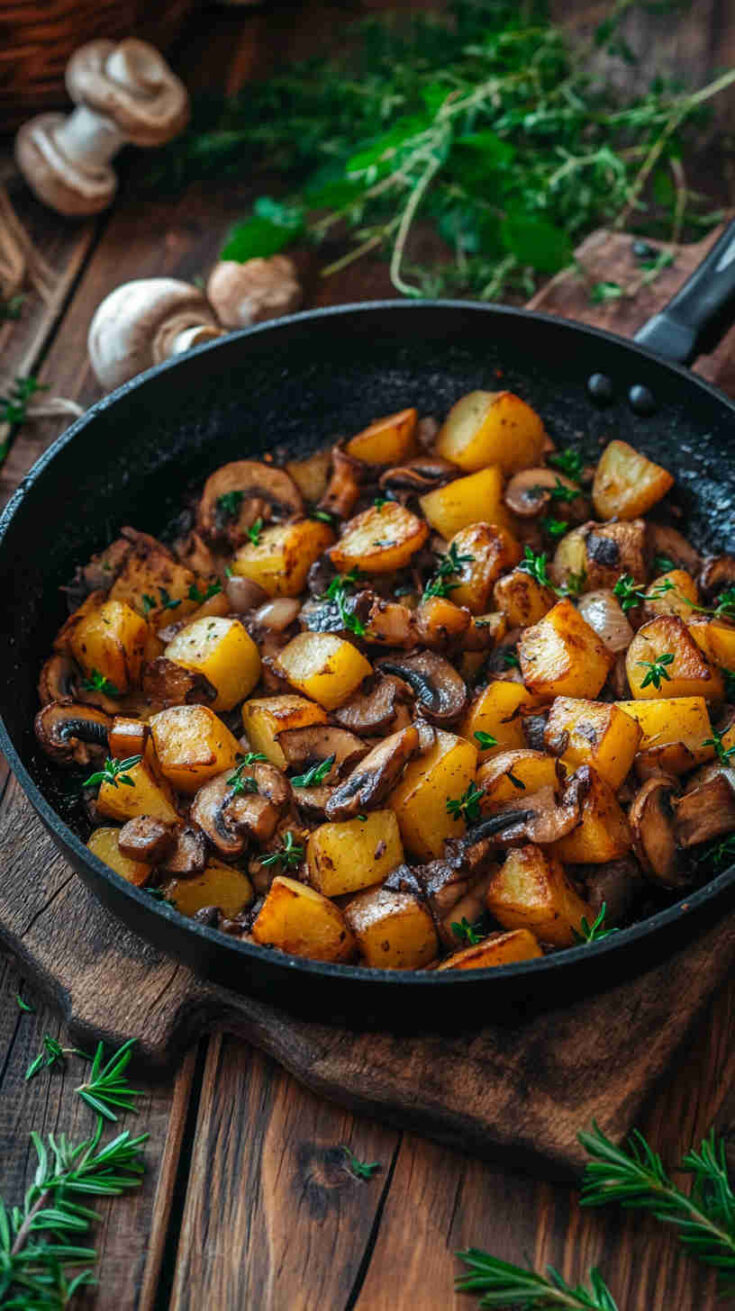 No fancy techniques, no long ingredient list, and almost no cleanup since everything cooks in one pan. It’s incredibly versatile: serve it as a main for meatless nights, a generous side with eggs or grilled chicken, or even breakfast hash-style. The contrast of textures—crispy potatoes against silky mushrooms—is addictive, and the whole thing feels cozy and homemade without any stress.