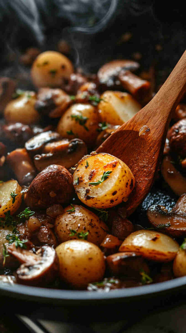 - Check and adjust — Taste a potato and a mushroom. Need more salt? Pepper? A little more herb? Season generously now—potatoes love it. If it looks dry, add a tiny splash of water or broth.