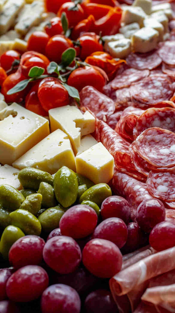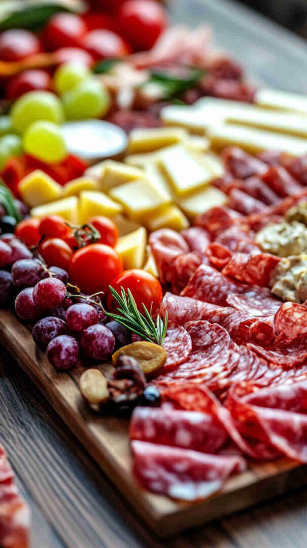 - Fill with fresh color: Scatter cherry tomatoes and grapes into any gaps. They add sweetness, freshness, and that “wow” color that makes a platter look abundant.