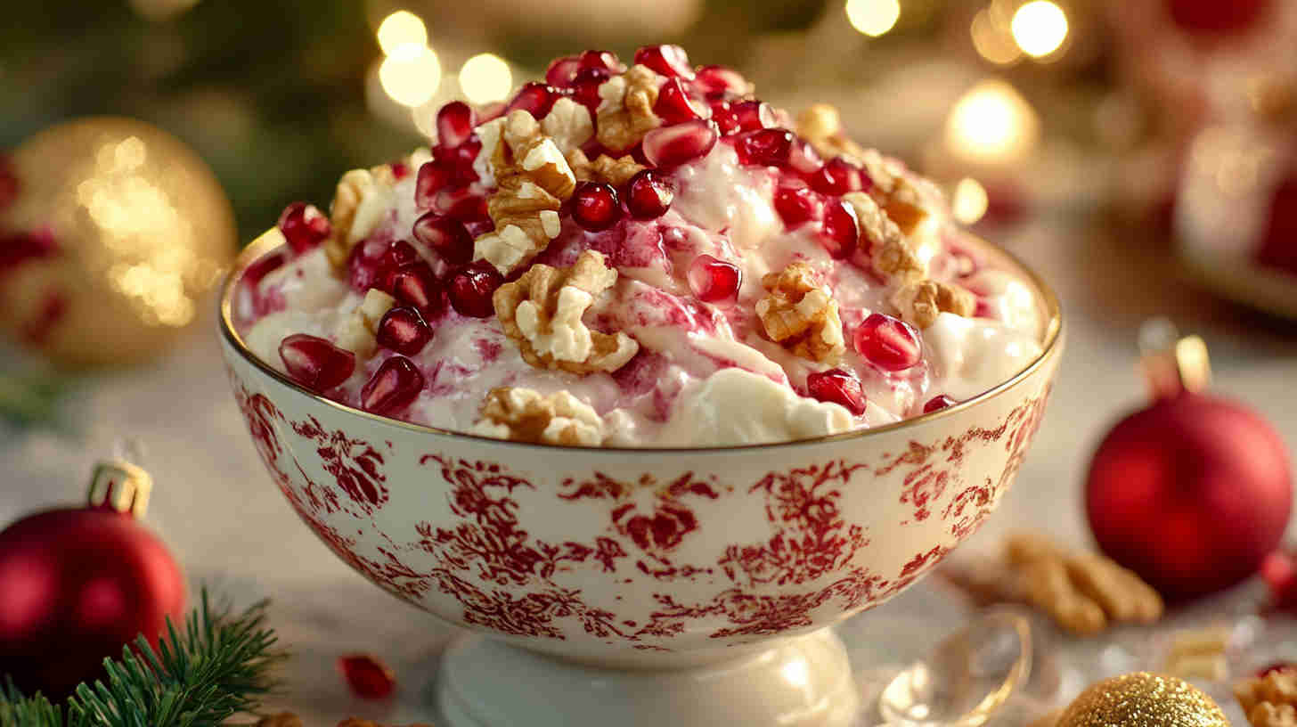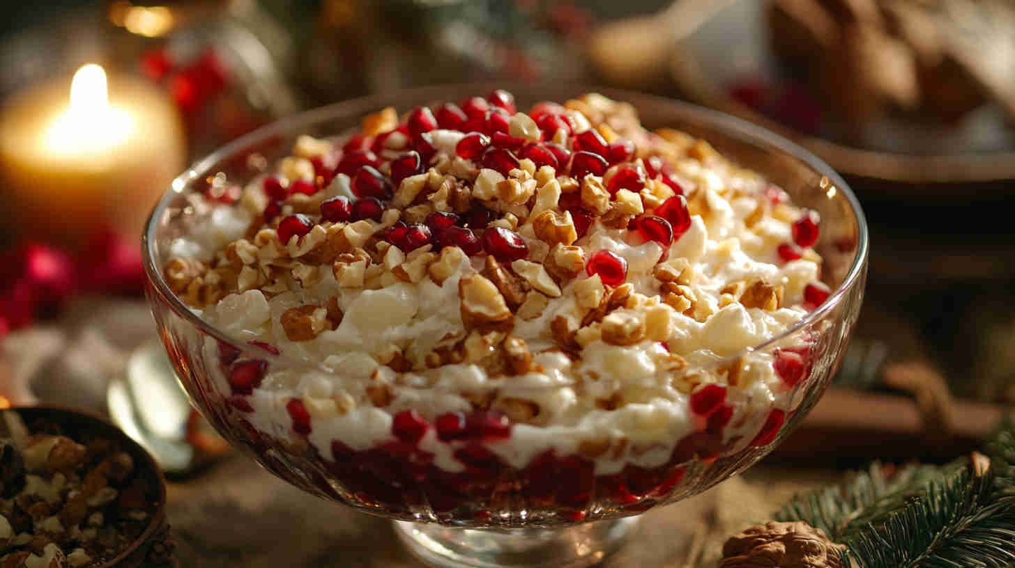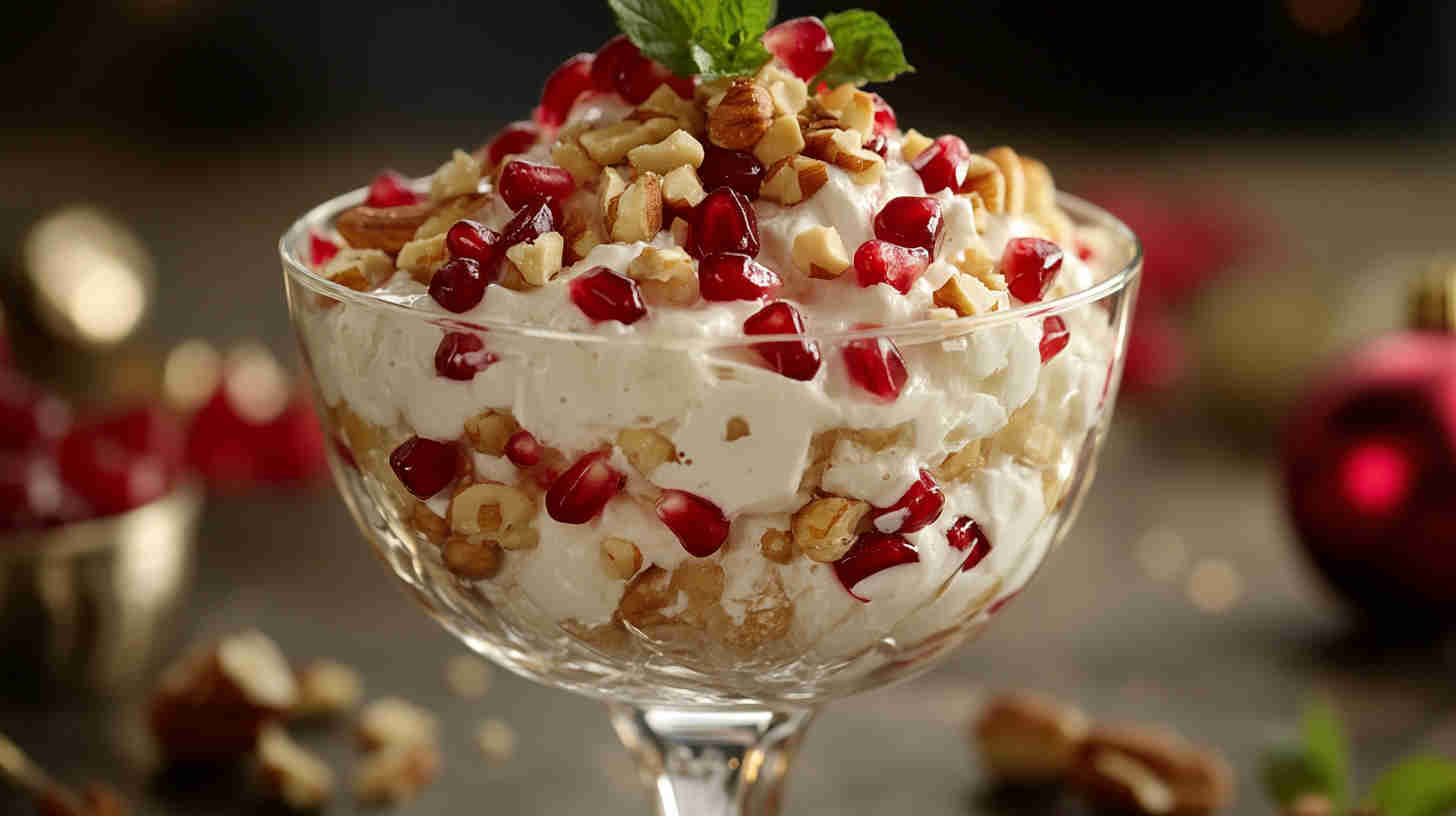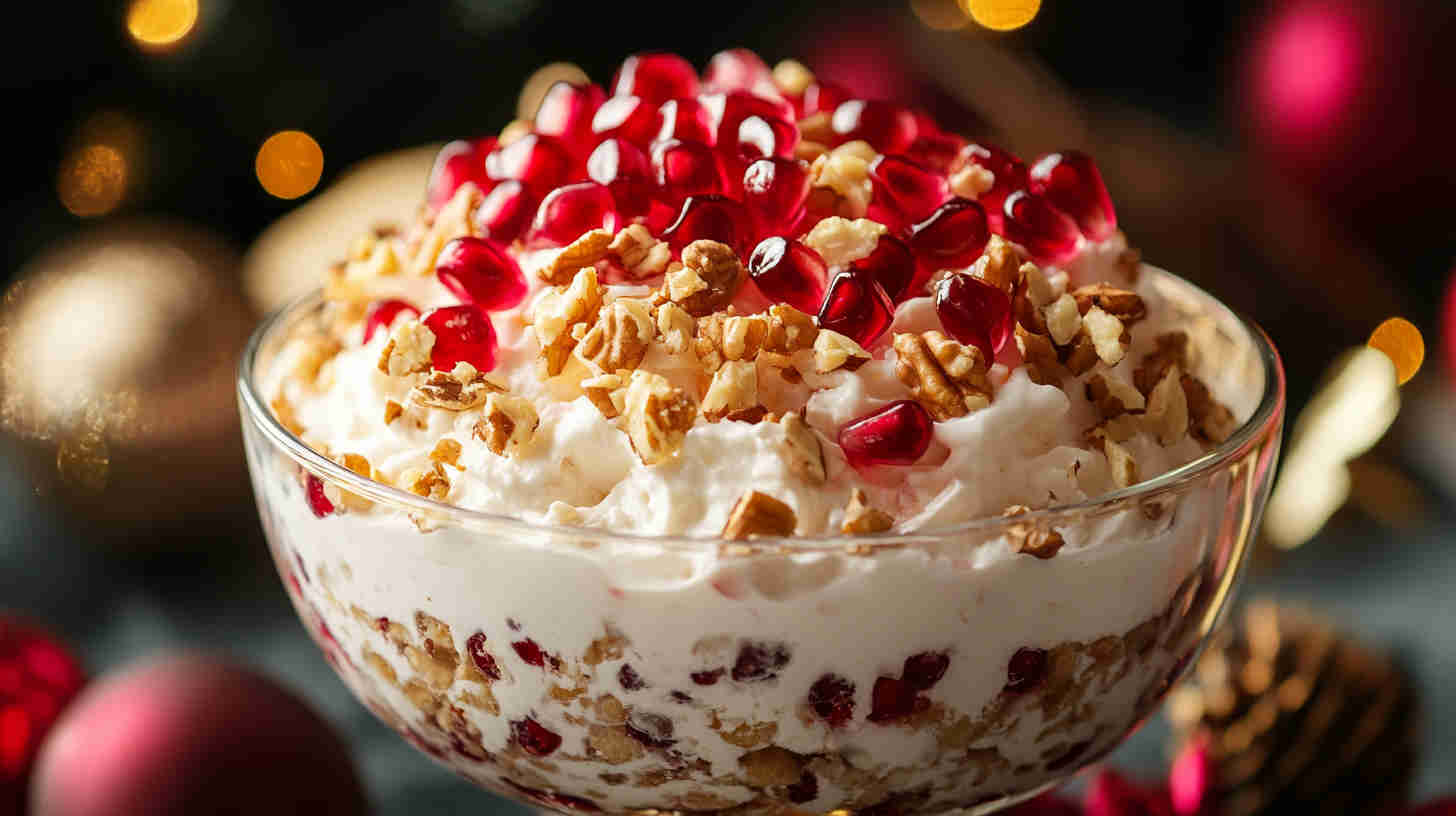 Festive creamy ambrosia with pomegranate seeds, nuts, mini marshmallows, tropical fruits – vibrant, crunchy, holiday-perfect delight!