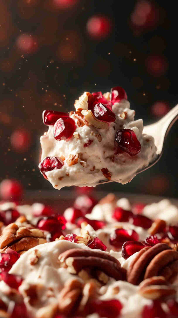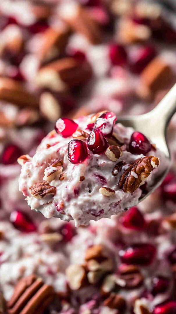 - Give everything one final gentle fold to combine without deflating the fluff. Cover and chill in the fridge for at least 4 hours (overnight is magical for flavor melding). Before serving, top with reserved pomegranate arils, extra nuts, and a few cherries – scoop into bowls and enjoy the festive cheers!