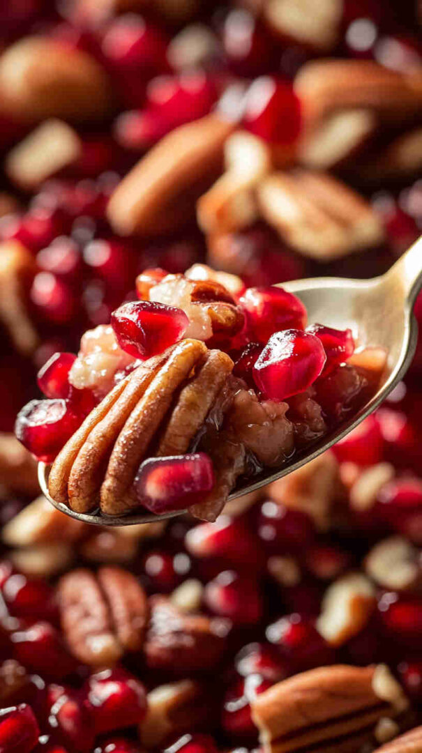 Sweetened shredded coconut adds texture and subtle chew. Toasted pecans and/or walnuts bring nutty richness and crunch that pairs beautifully with pomegranate. Sour cream (optional) adds balancing tang for depth without overpowering.