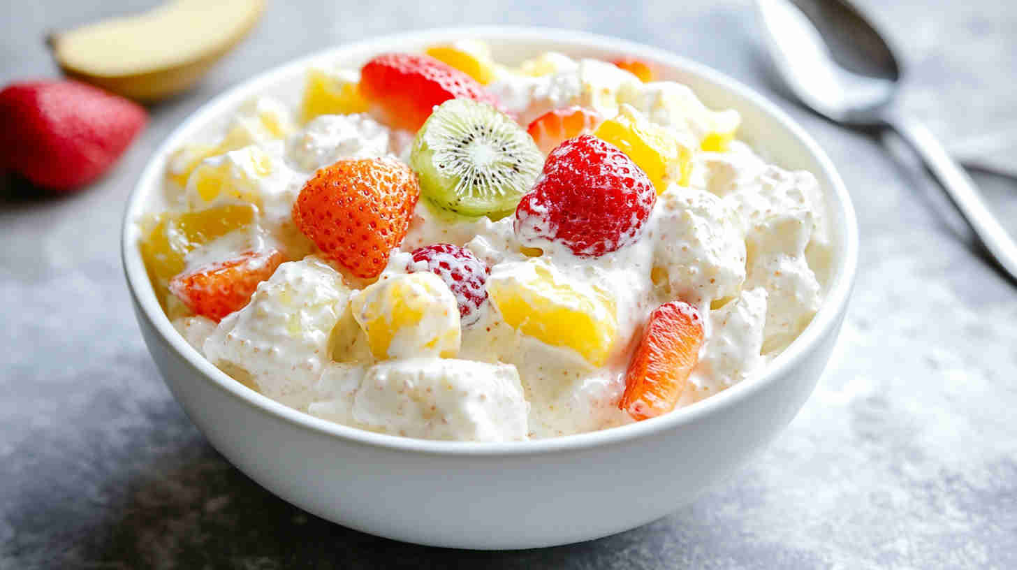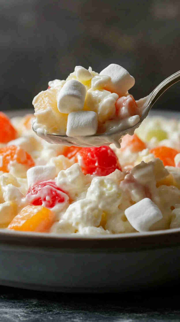 Sour cream acts as the creamy, tangy binder that holds everything together without needing whipped topping – it gives a richer, more homemade feel. Mini marshmallows provide sweetness and soft chew; use plain white or colorful fruit-flavored for visual appeal.