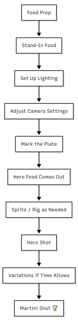On commercial shoots, the hero shot gets done first. Variations come after, only if schedule permits. In the industry, the hero dish is also called the beauty dish or beauty shot. The hero food must look its absolute best, which is why it’s never used for setup and never rushed.