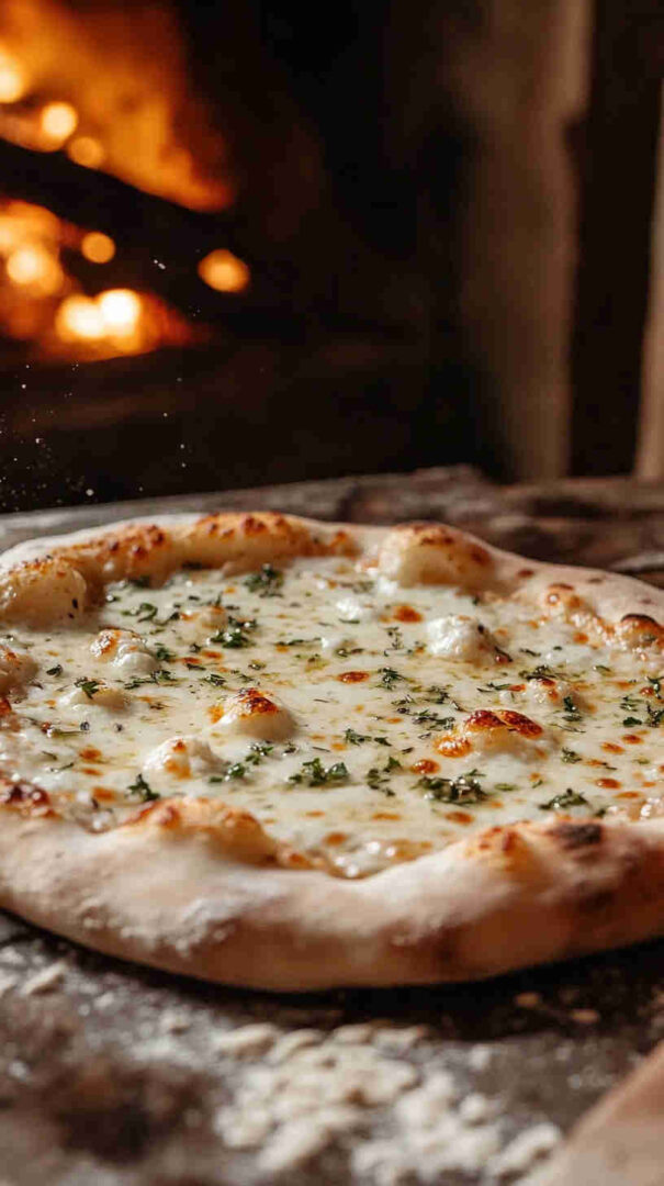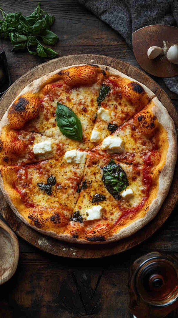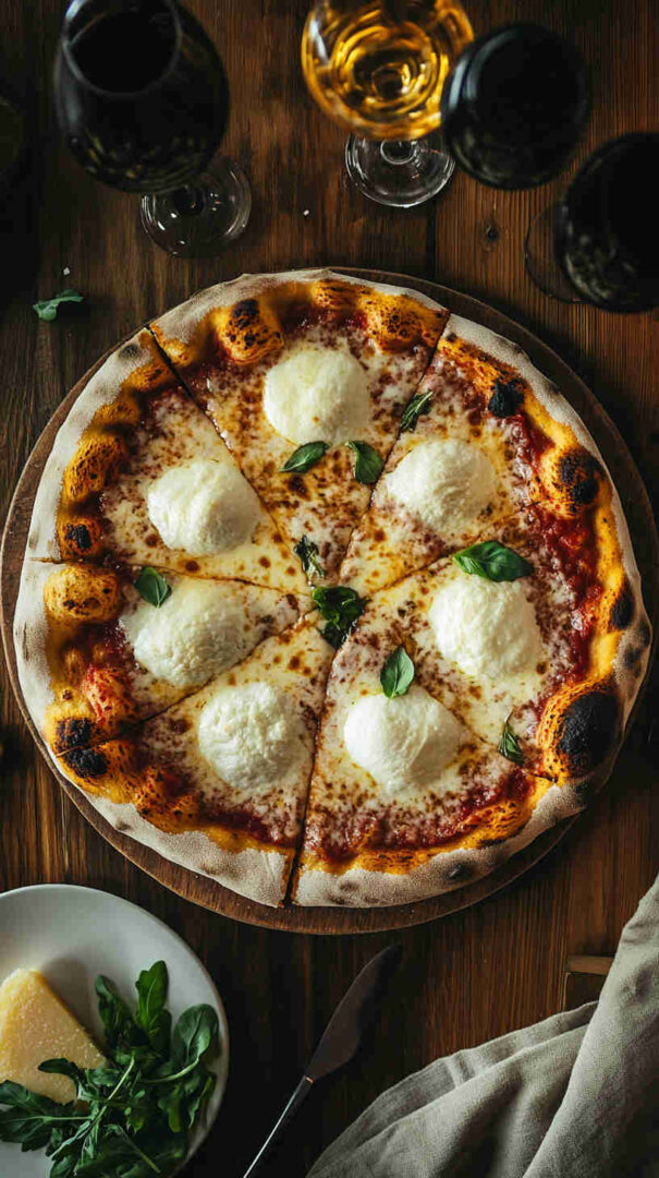 - Into the heat — Carefully slide the pizza onto the hot stone/steel. Bake 8–12 minutes until the crust is puffed, charred in spots, and cheeses are bubbly and golden. Rotate halfway if needed.