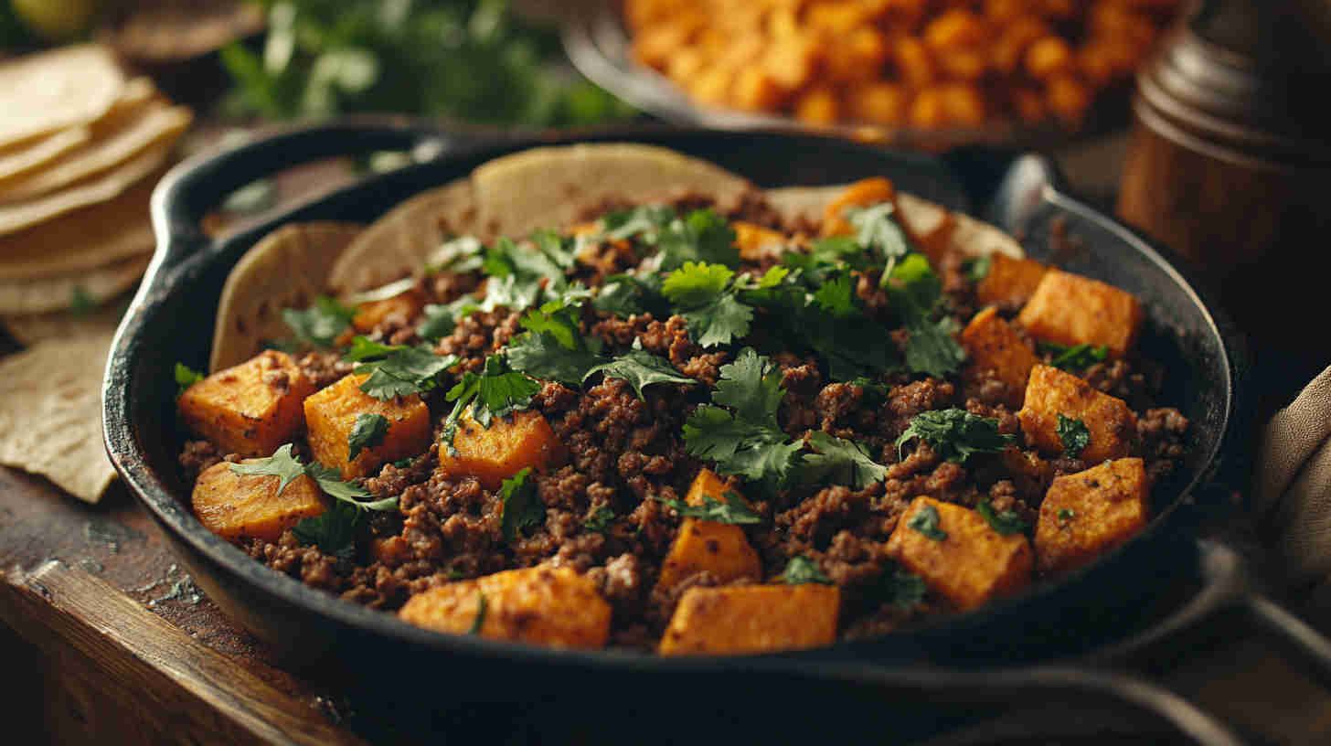 Savory one-pan skillet with seasoned ground beef, tender sweet potatoes, and Tex-Mex spices—easy, healthy, and delicious!