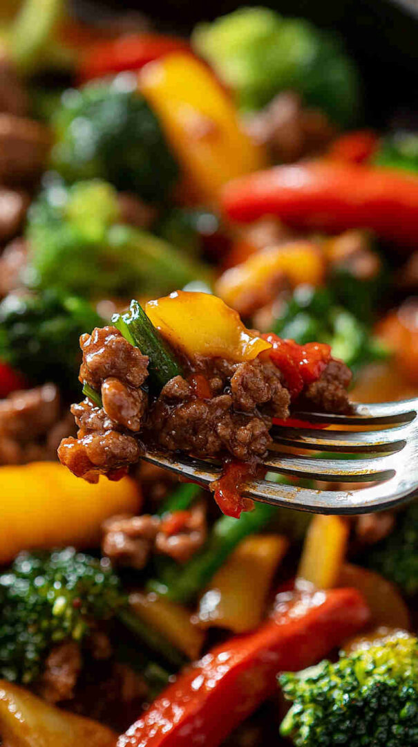 This quick and colorful Ground Beef and Veggie Stir-Fry features lean ground beef sautéed with crisp bell peppers, broccoli, carrots, snap peas, and onions in a savory garlic-ginger soy sauce. It’s a nutritious, high-protein meal packed with vibrant vegetables, ready in under 30 minutes—perfect for busy weeknights and picky eaters alike!