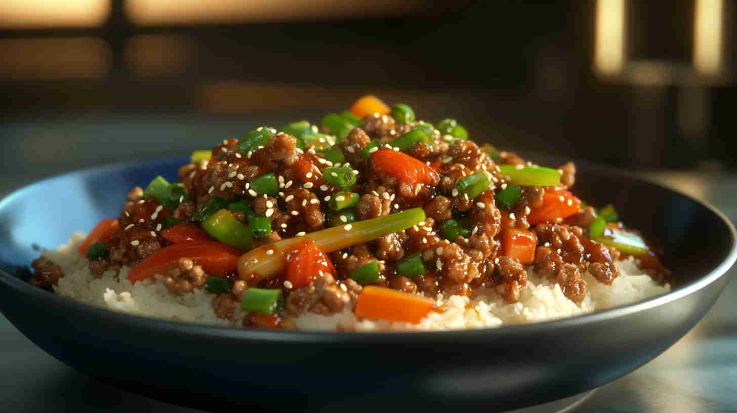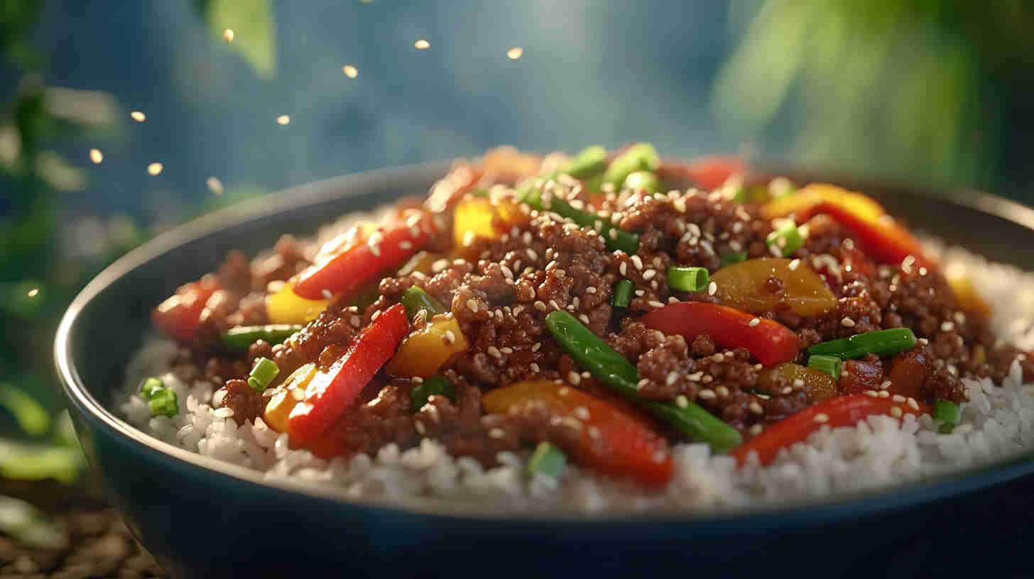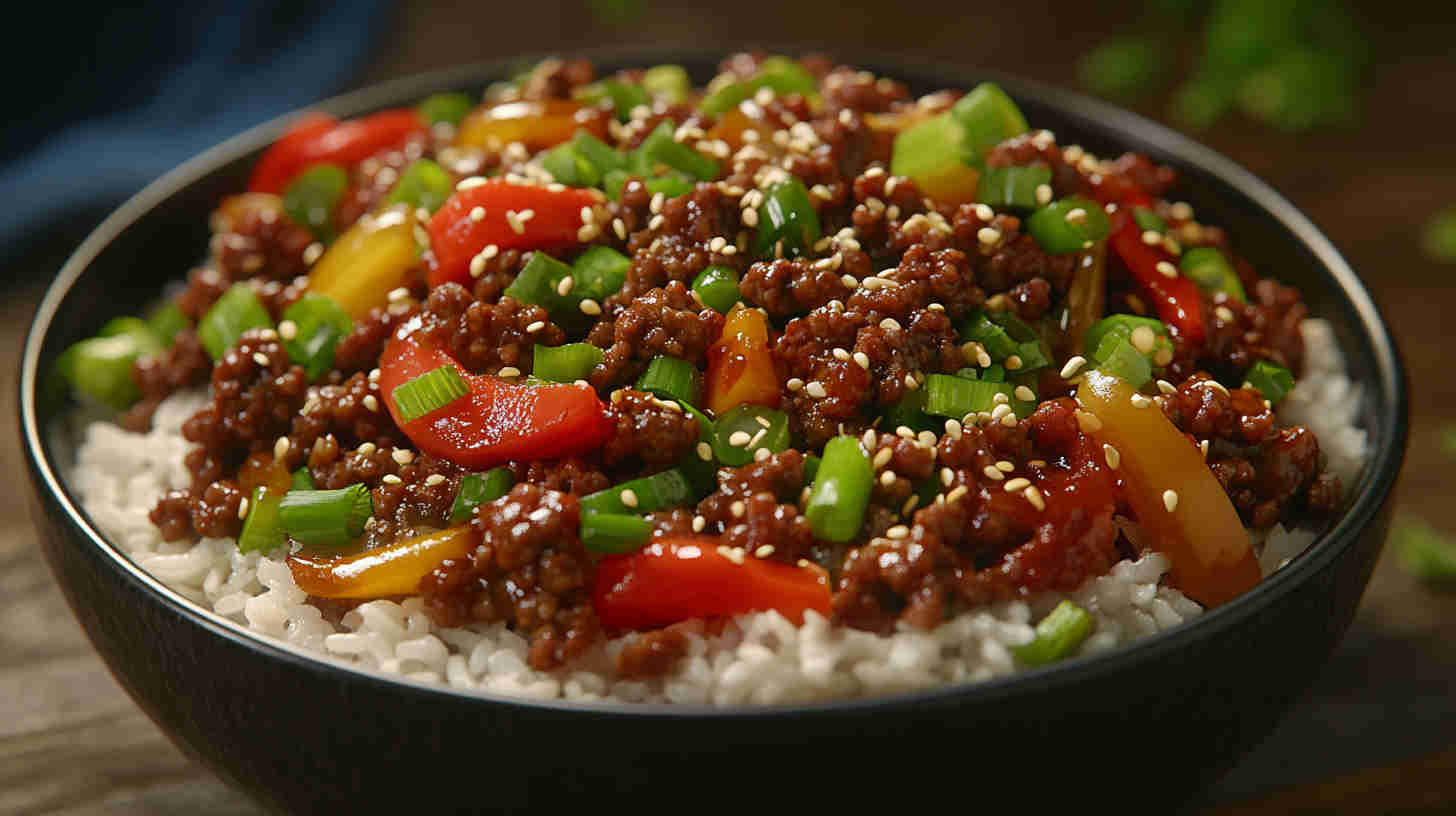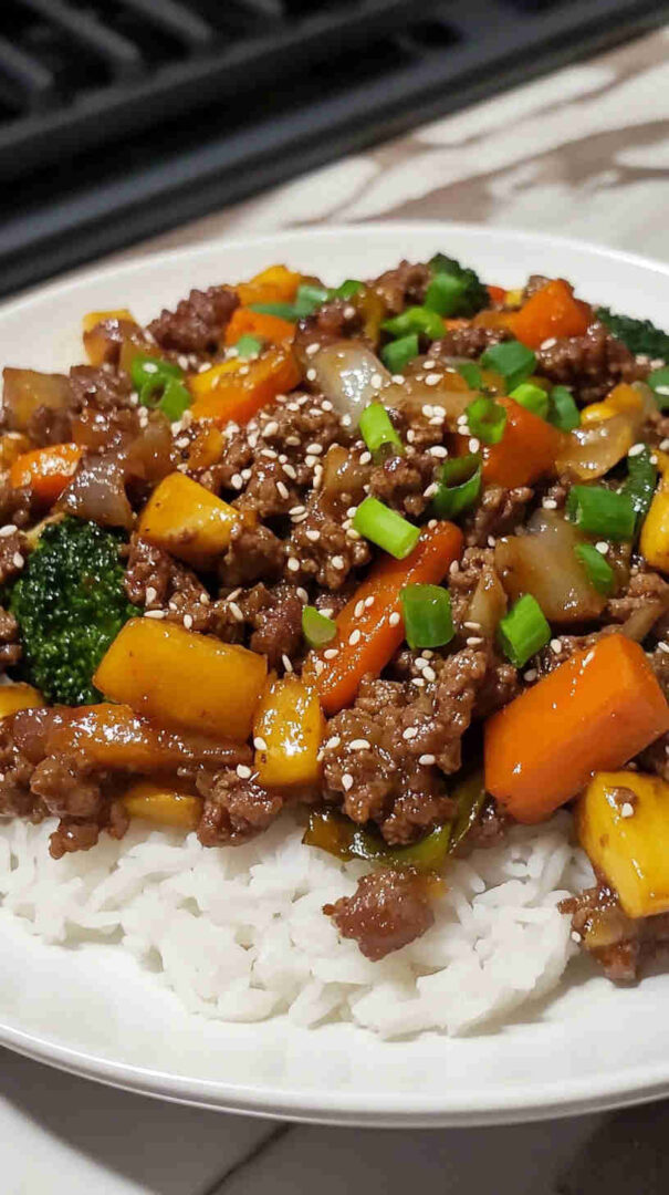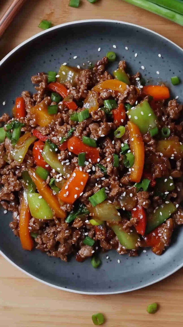 Fast, flavorful ground beef stir-fry loaded with colorful veggies and garlic-ginger sauce—healthy takeout at home!