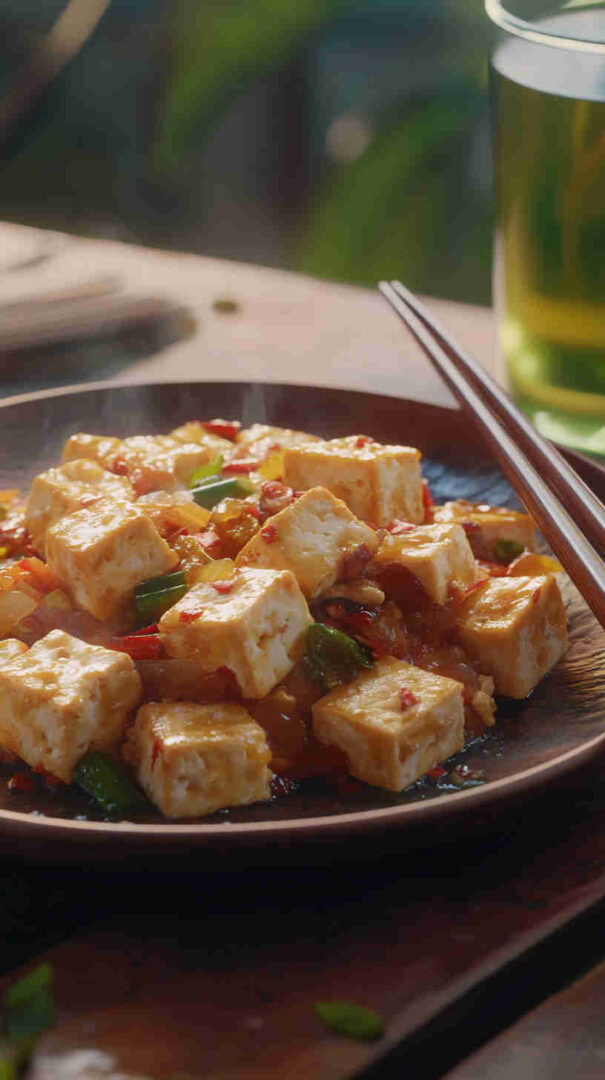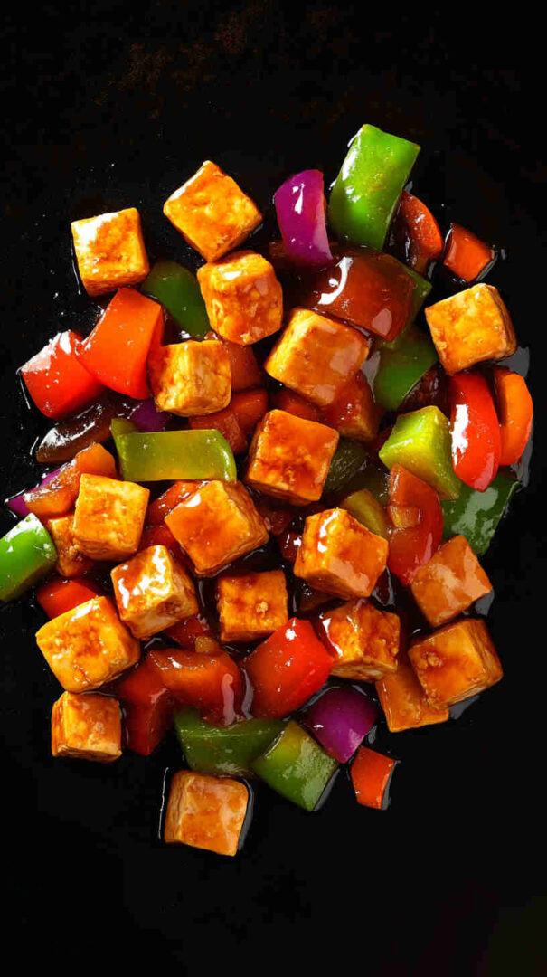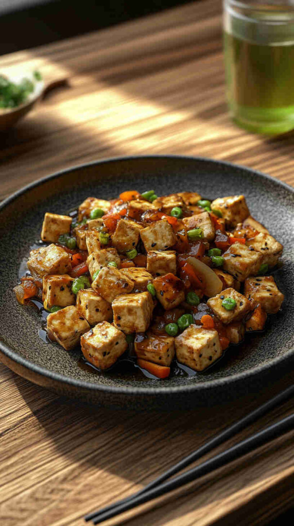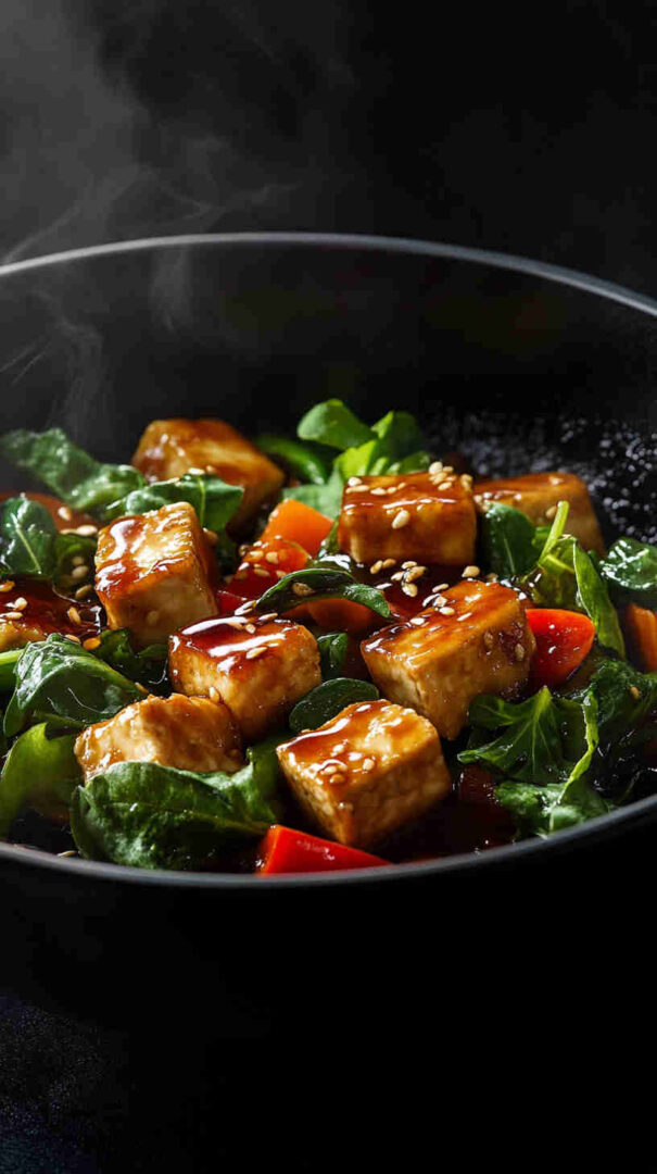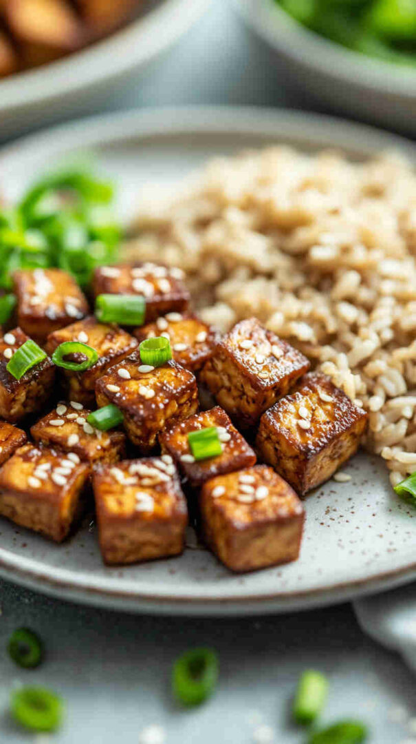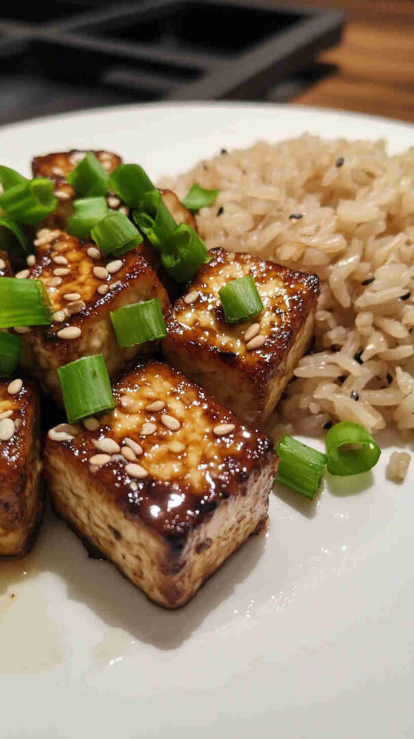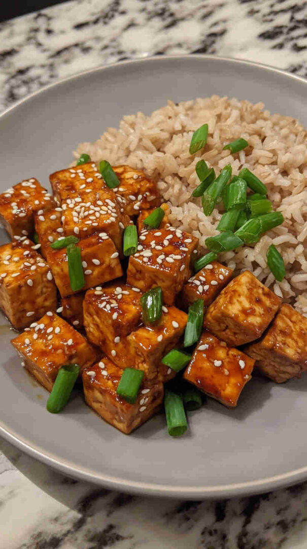 A touch of maple syrup or brown sugar balances the savory notes. Cornstarch helps create a silky sauce and crisp tofu coating. Optional green onions and sesame seeds add freshness and texture.