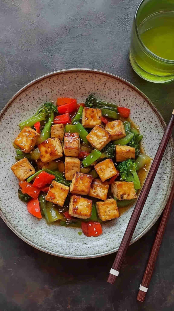 This High-Protein Vegan Tofu Stir-Fry features crispy golden tofu cubes stir-fried with colorful veggies like broccoli, bell peppers, carrots, and edamame in a savory garlic-ginger soy-sesame sauce. It’s a quick, nutrient-dense meal bursting with texture, umami, and over 25g protein per serving—perfect for busy weeknights.