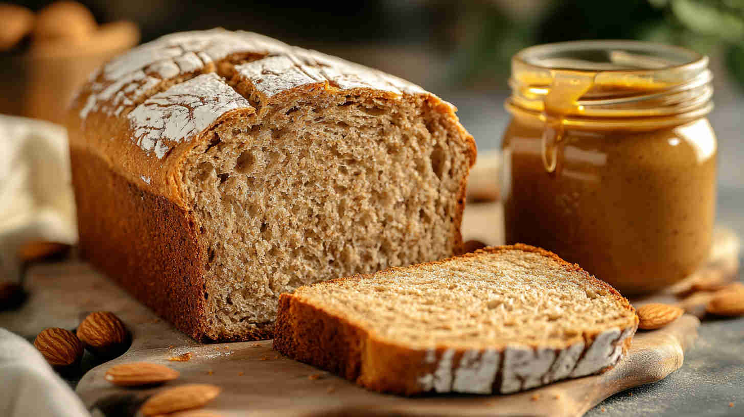 Soft, honey-sweetened fresh milled wheat bread with nutty almond butter spread—wholesome, fluffy, and perfect for sandwiches or toast.