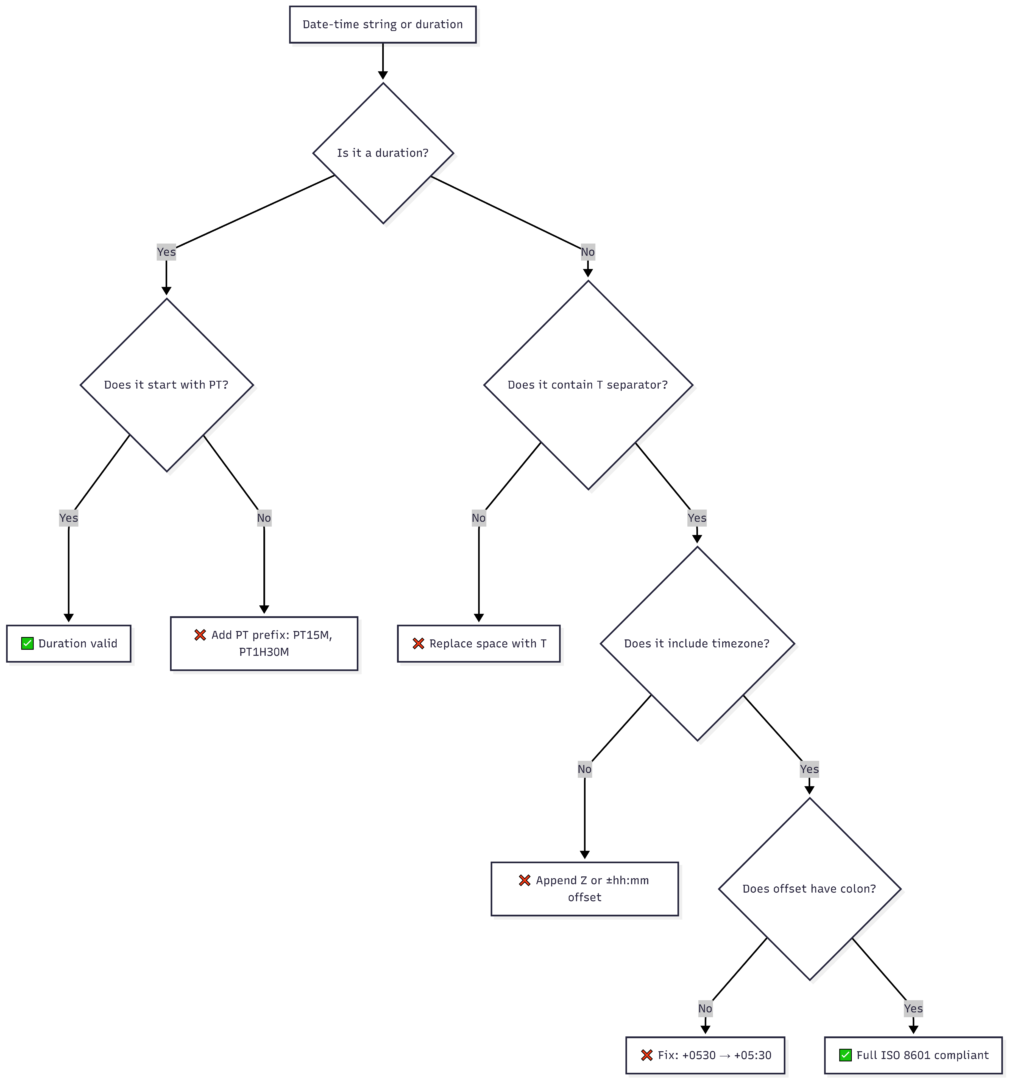 | Date-only string | Missing time component | Append T00:00:00Z |