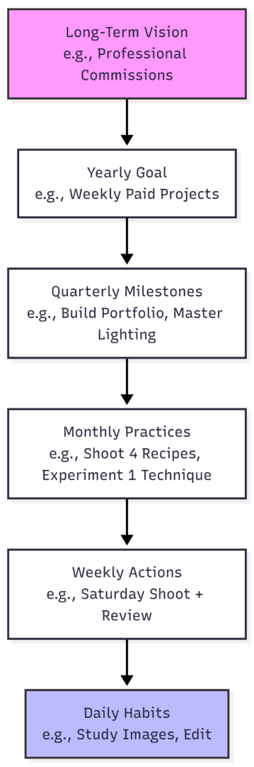 Success varies: for some, it’s creative freedom; for others, paid work or a strong Instagram presence. Clarify yours. Ask: What would a “magic wand” grant? A pro portfolio? Cookbook credits? Supplemental income? This long-term vision guides shorter goals. - Plan Backward from Your Dream