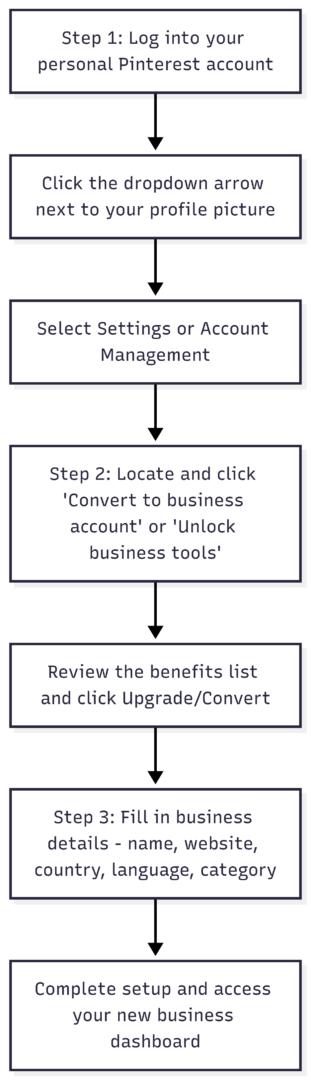 In the left menu, go to Account Management. Find the section labeled “Convert to business account” or “Unlock business tools.” Click Convert account (or Upgrade). Pinterest will show you everything you gain — review it, then confirm.