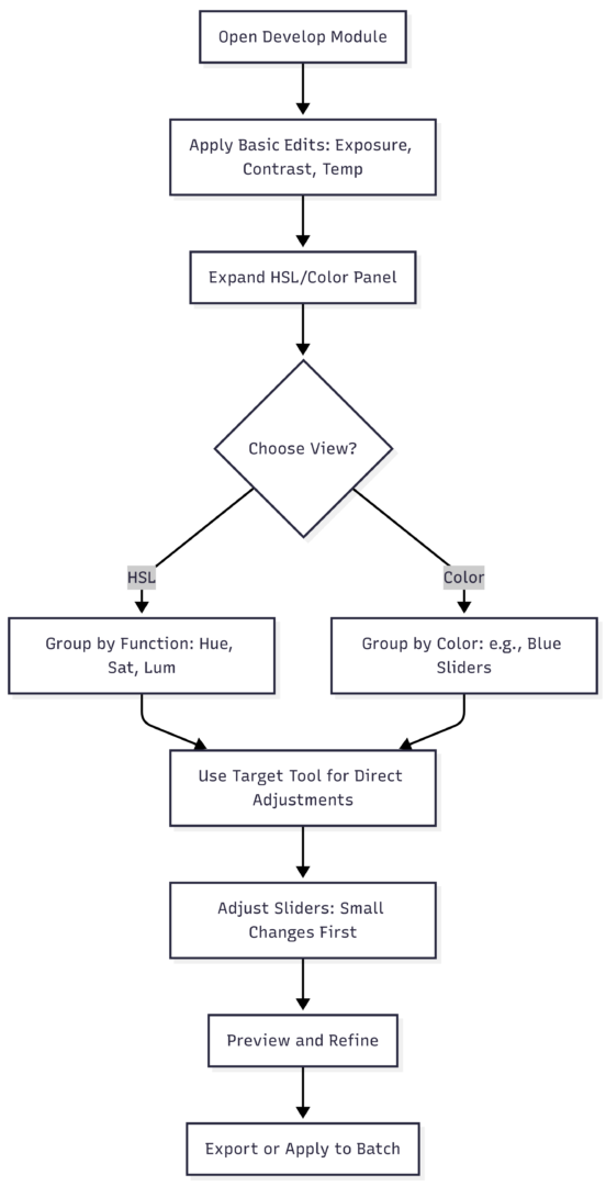 Start by importing your RAW or JPEG files into Lightroom. In the Develop module, ensure you’ve applied basic edits first—exposure, contrast, whites, blacks, temperature, and tint. These global changes provide a solid foundation, as HSL/Color is best for refinements.
