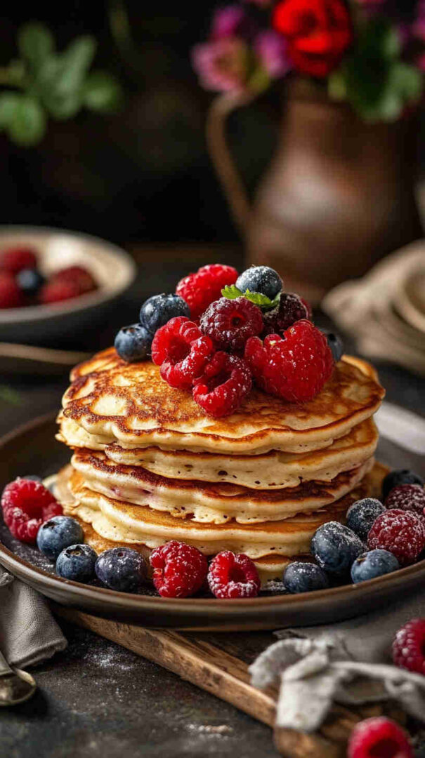 Fluffy, creamy ricotta pancakes with lemon zest—light, moist Italian breakfast delight topped with berries and honey.