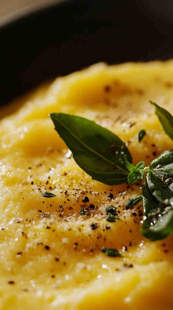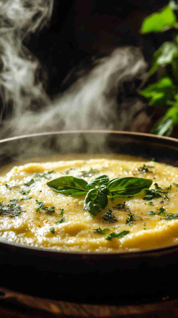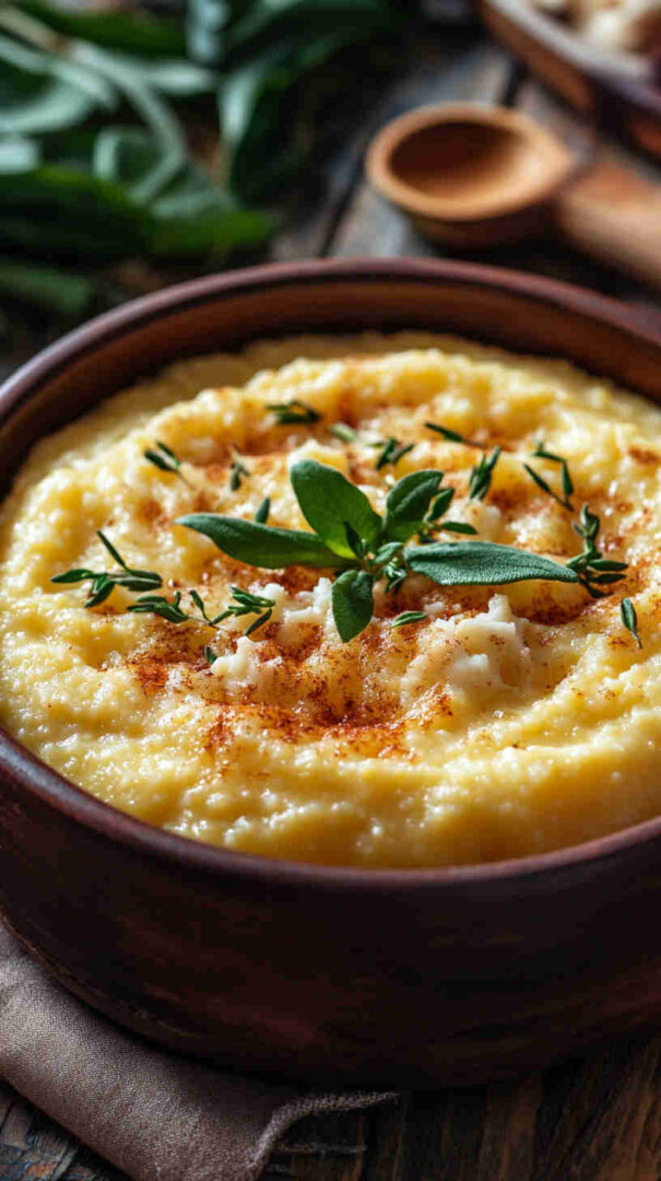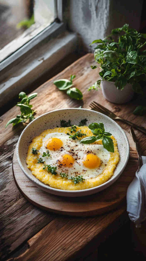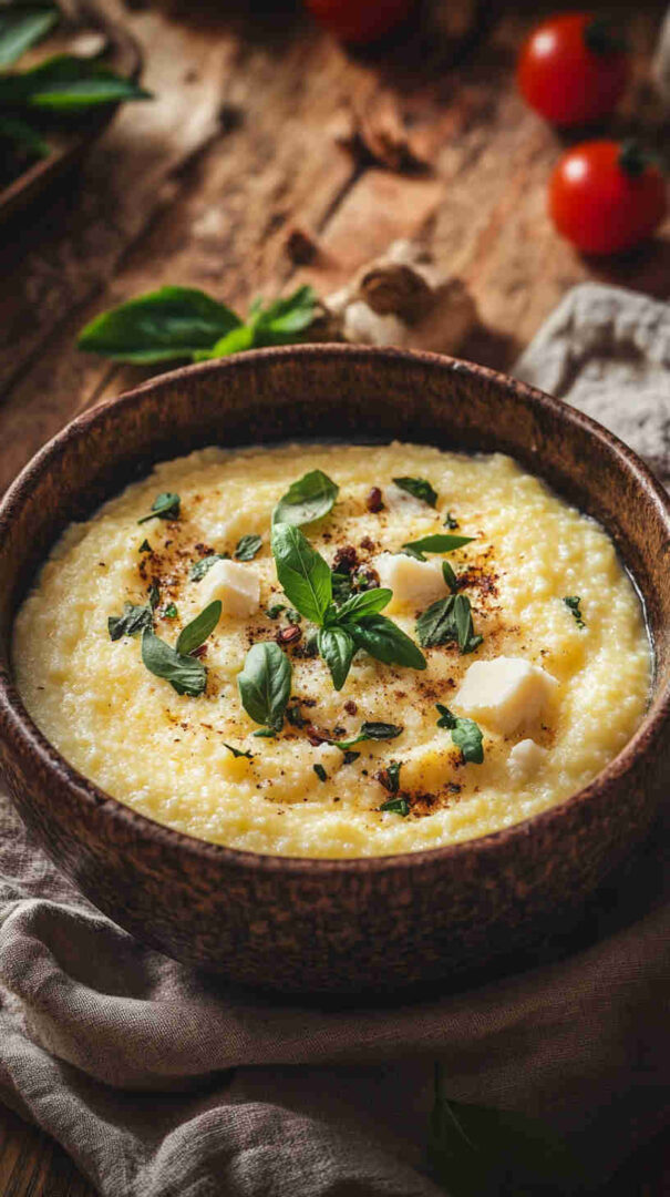 Creamy Italian polenta loaded with Parmesan, Pecorino, and fresh herbs—cozy, cheesy breakfast bliss in a bowl.