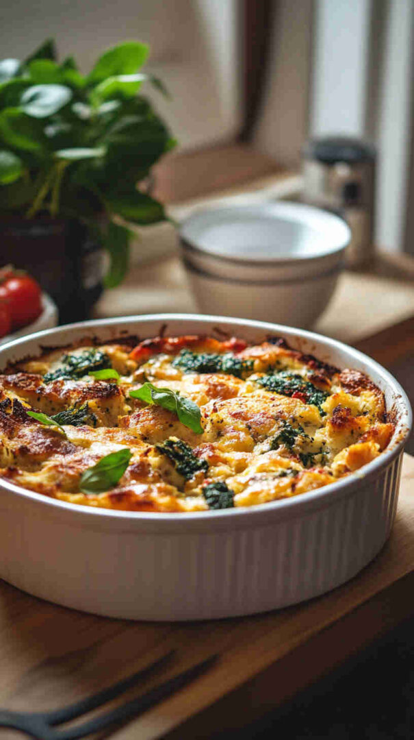 - Bake to perfection — When ready, remove from fridge and let sit at room temp for 15-20 minutes. Preheat oven if needed. Bake covered for 30 minutes, then uncover and bake another 15-20 minutes until puffed, golden, and set in the center (a knife inserted should come out clean).