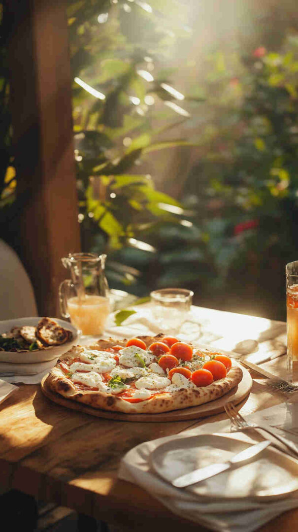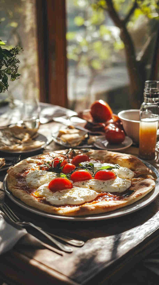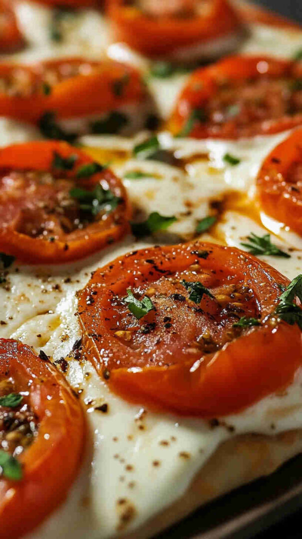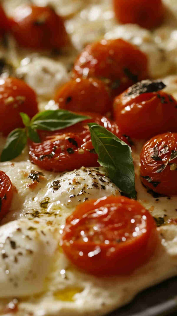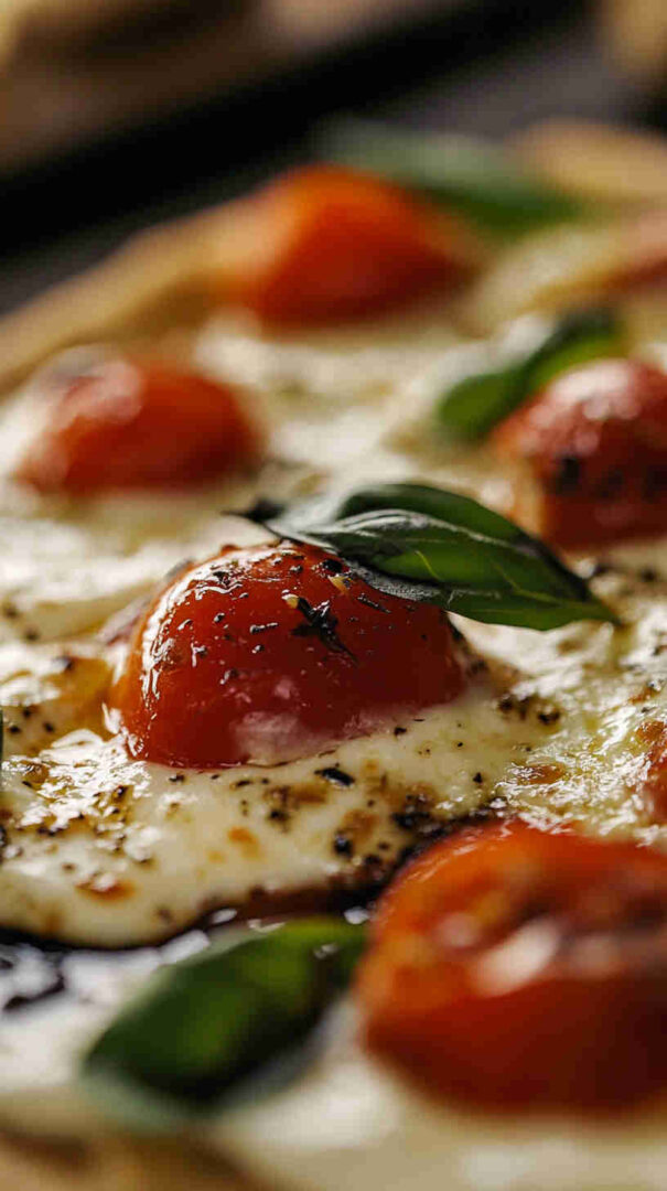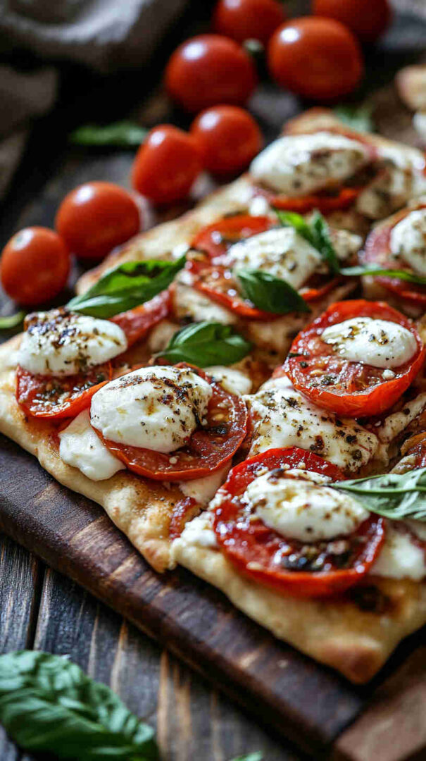 Crispy flatbread topped with melty mozzarella, juicy tomatoes, basil & balsamic—elegant Italian brunch perfection!