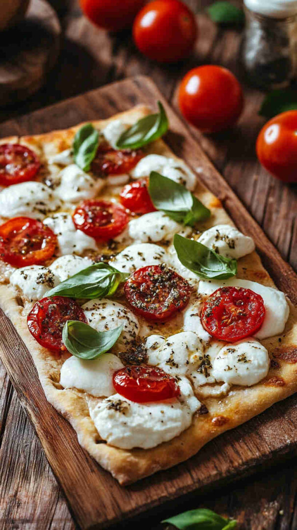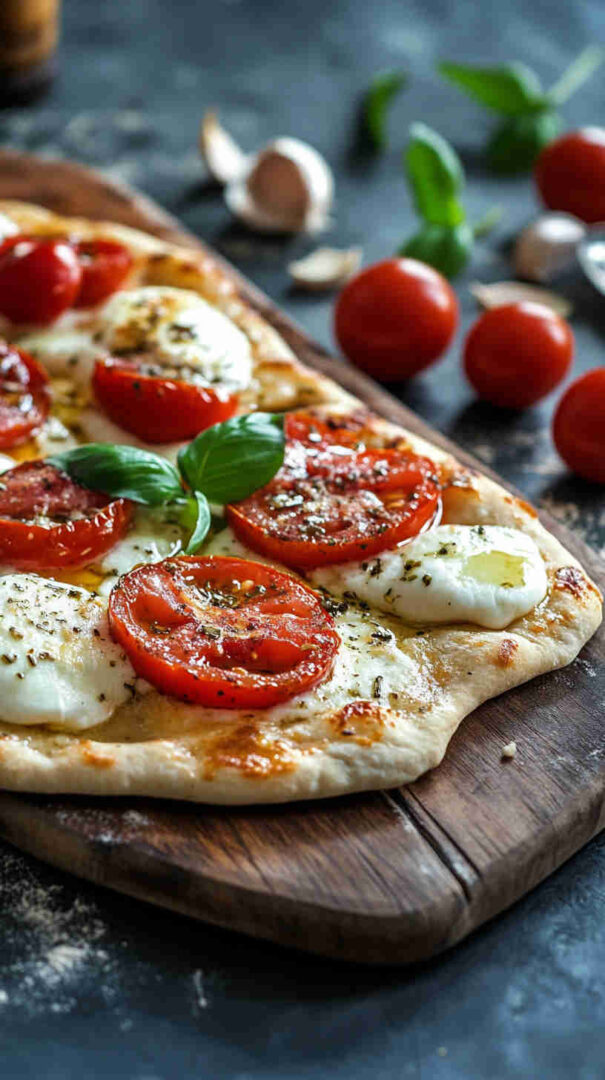 Preheat your oven (or grill) very hot (450–500°F / 230–260°C) for a crisp base and bubbly cheese. Pat tomato slices dry with paper towels to prevent a soggy flatbread. Slice mozzarella thinly or tear it so it melts evenly.