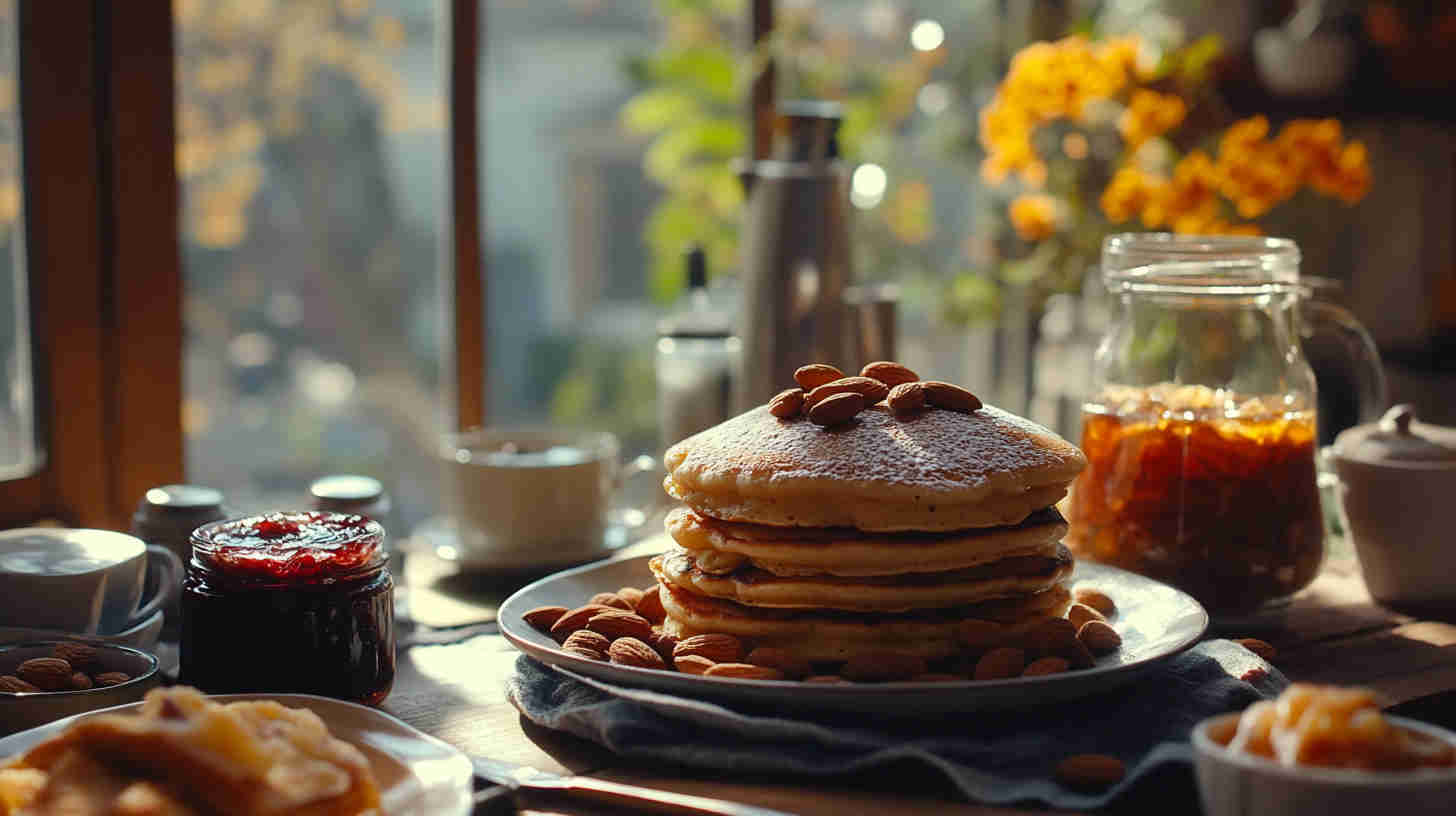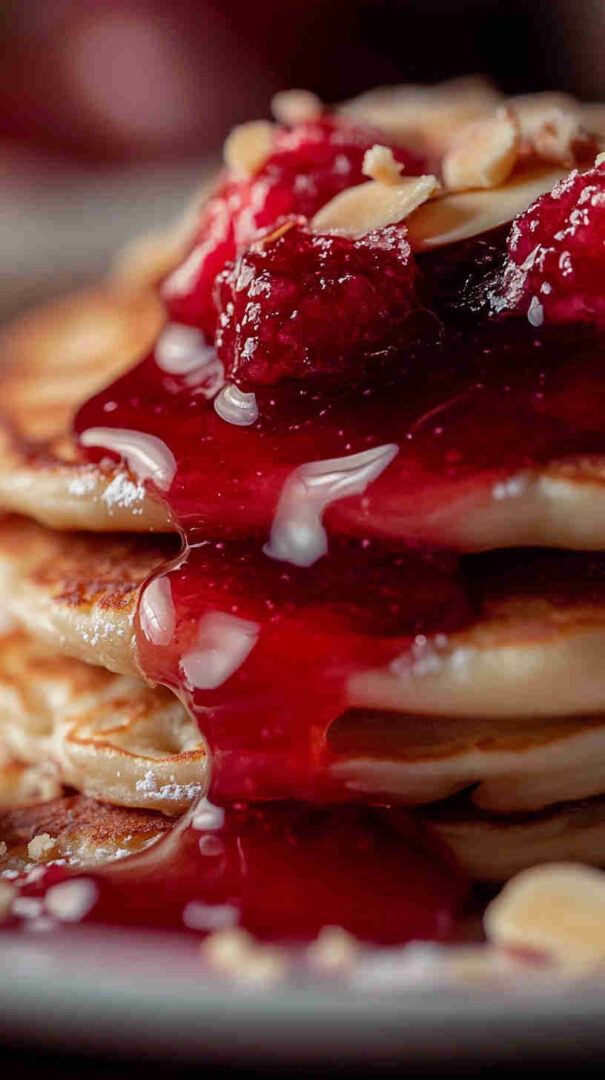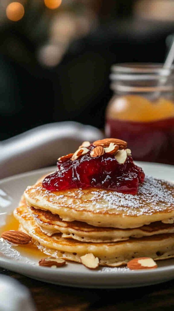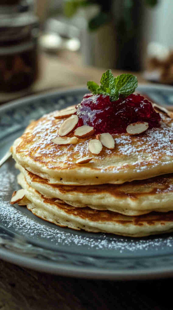 Keep finished pancakes warm in a low oven (100°C) stacked between parchment paper. Toast almonds in a dry pan over medium heat—shake frequently and remove as soon as they’re fragrant and lightly golden (they burn fast). Warm jam slightly before spreading so it’s easier to swirl.