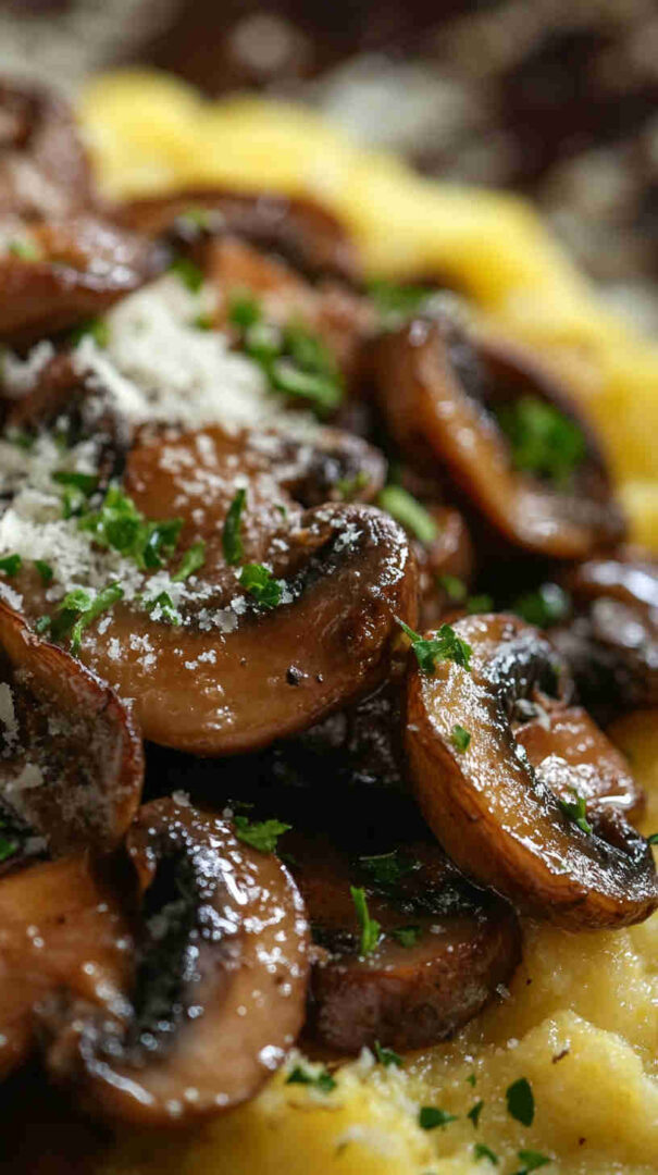 Creamy Parmesan polenta topped with garlicky sautéed mushrooms—cozy, elegant Italian brunch comfort!