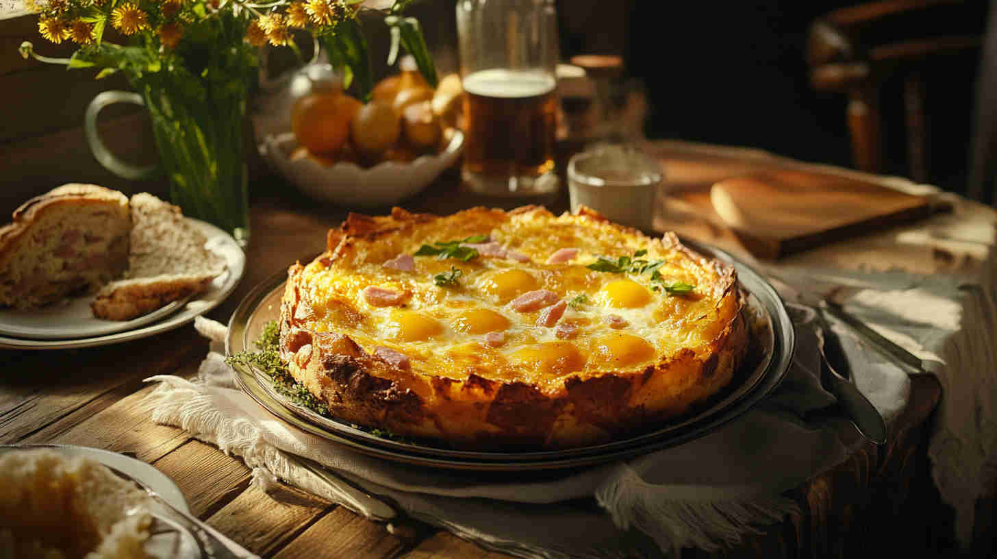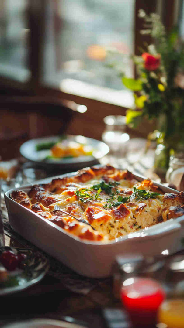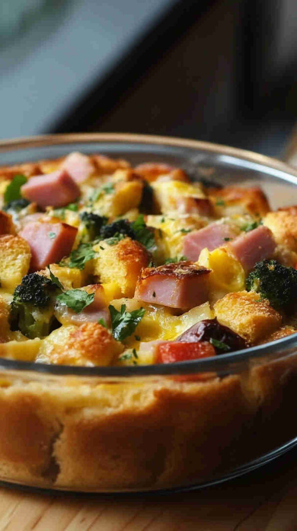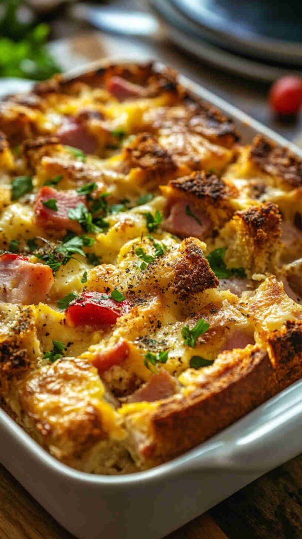 Overnight chilling is strongly recommended—texture improves dramatically. Use day-old or slightly stale bread for best custard absorption. Vegetarian version is just as delicious—add extra mushrooms or roasted zucchini instead of ham. Reheats wonderfully—cover with foil and warm in 160°C oven.