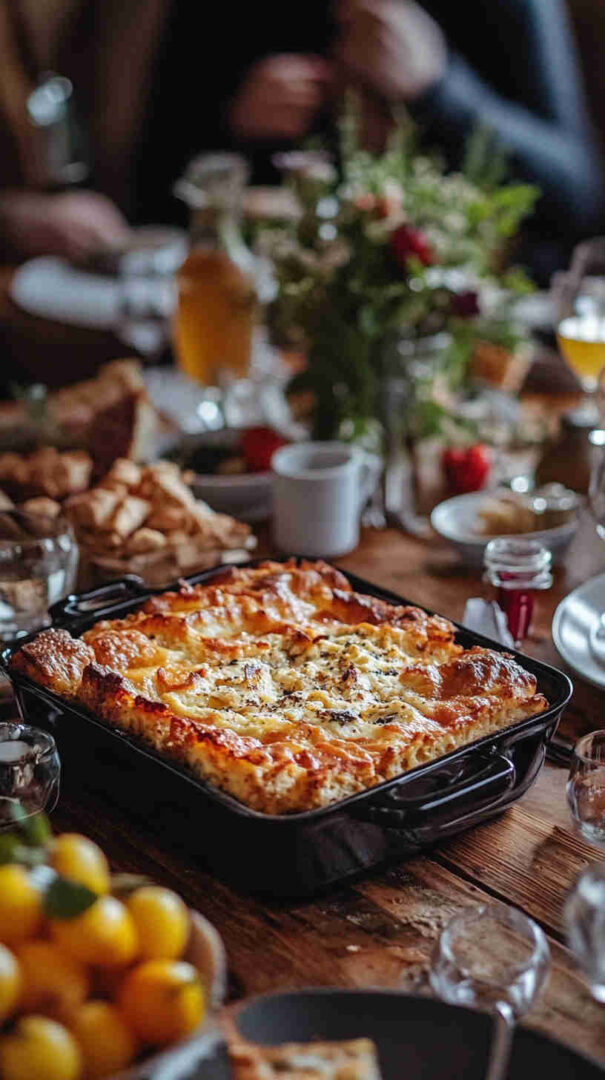 - Remove from oven and let rest 10–15 minutes—this sets it perfectly for clean slices. Garnish with fresh basil if desired, cut into squares, and serve warm with a crisp green salad or fresh fruit. Enjoy this beautiful, make-ahead Italian brunch strata that tastes like pure comfort and hospitality!