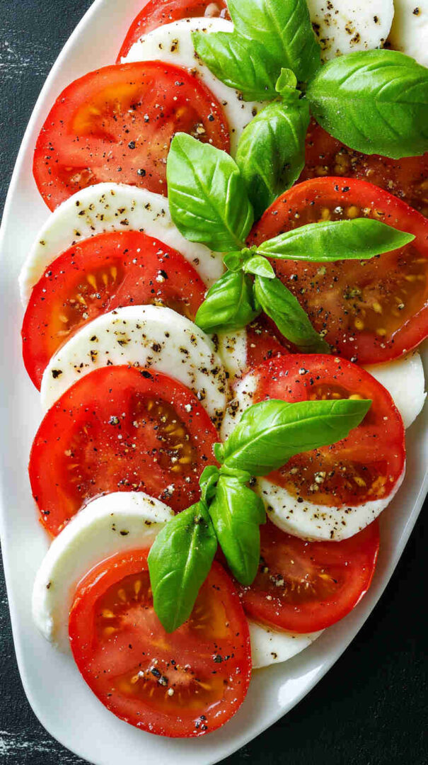 - Layer elegantly — Alternate slices of tomato and mozzarella on the platter, tucking a fresh basil leaf between each pair. This creates the classic red-white-green Italian flag pattern that makes the dish so inviting.