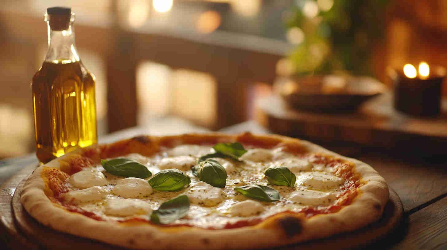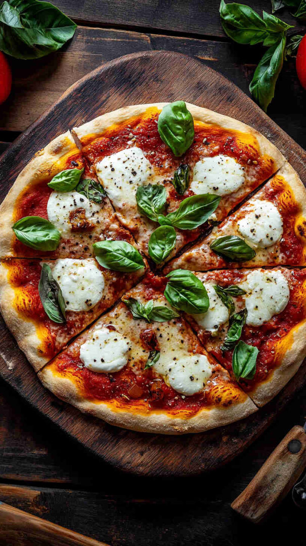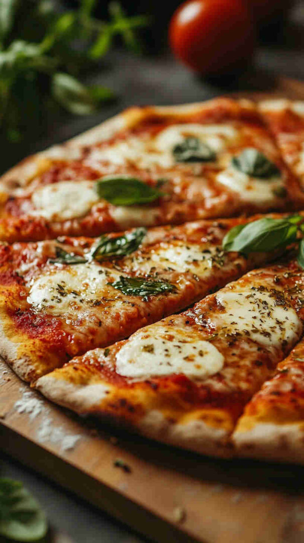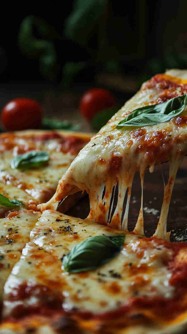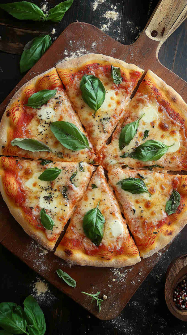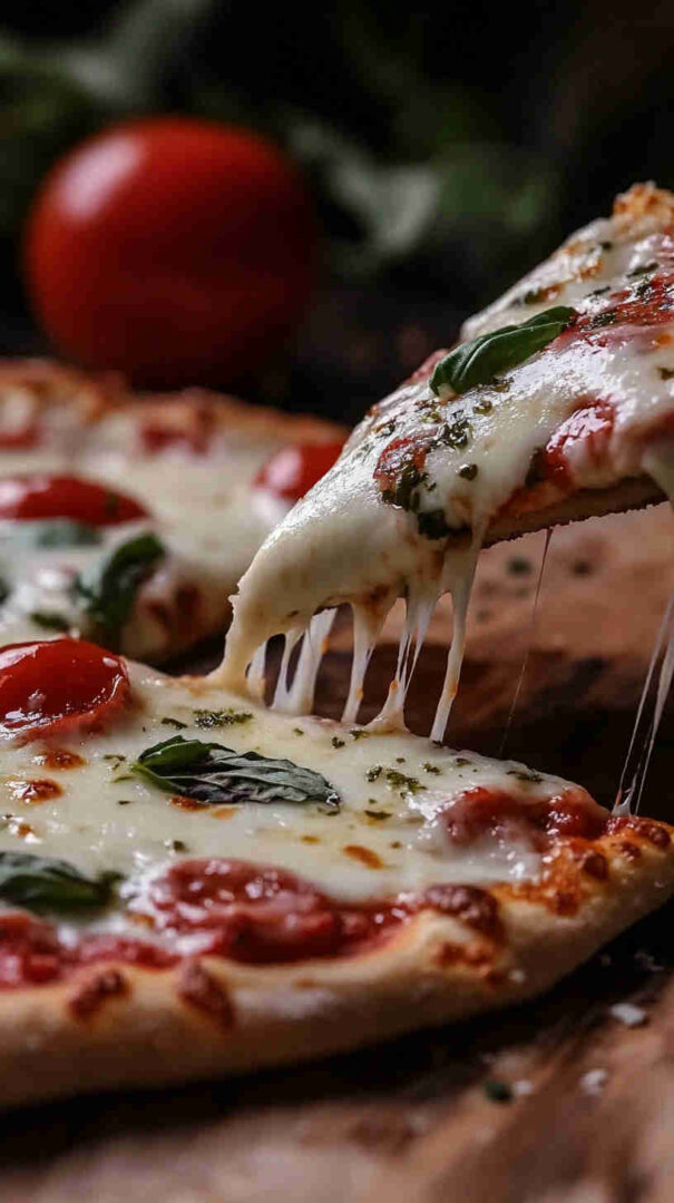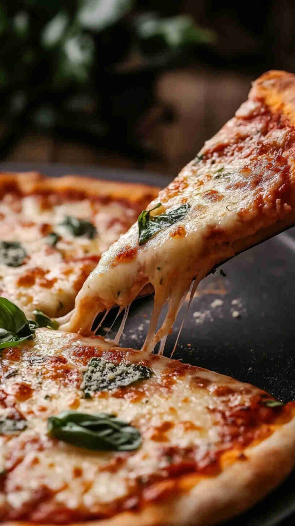 - Finally, pull the pizza out, scatter fresh basil leaves all over, drizzle with more extra-virgin olive oil, and let it rest for 2-3 minutes before slicing into wedges. Serve immediately while the cheese is still gloriously stretchy!