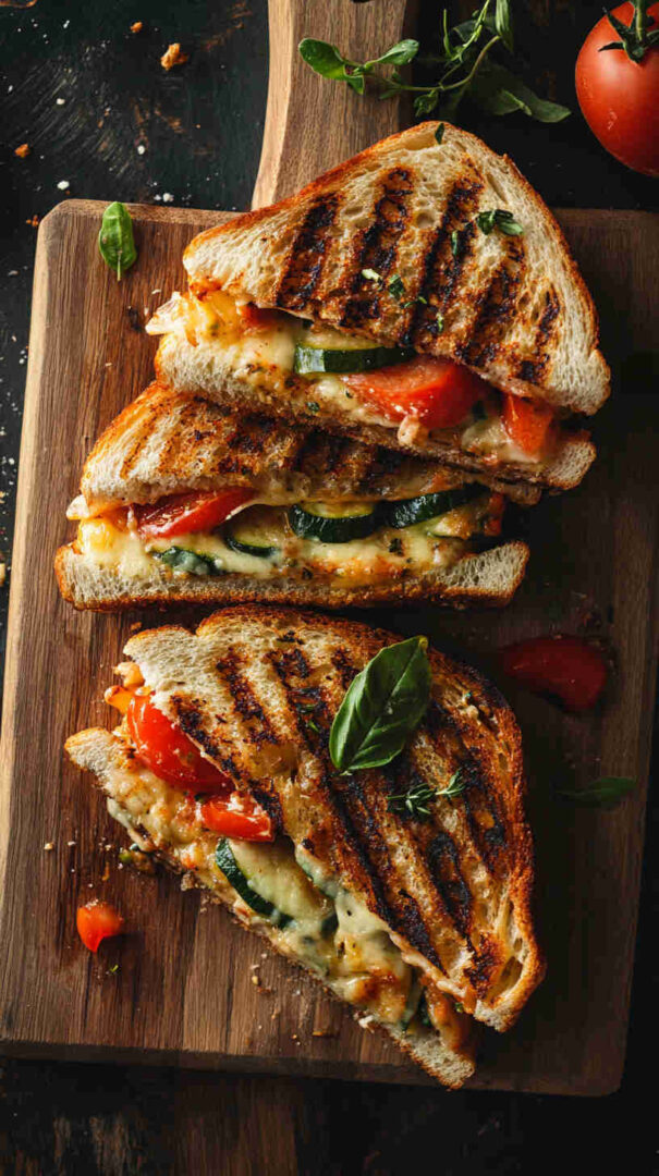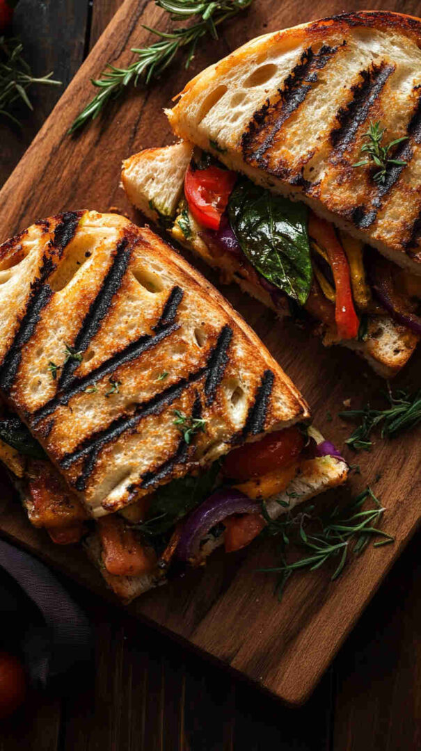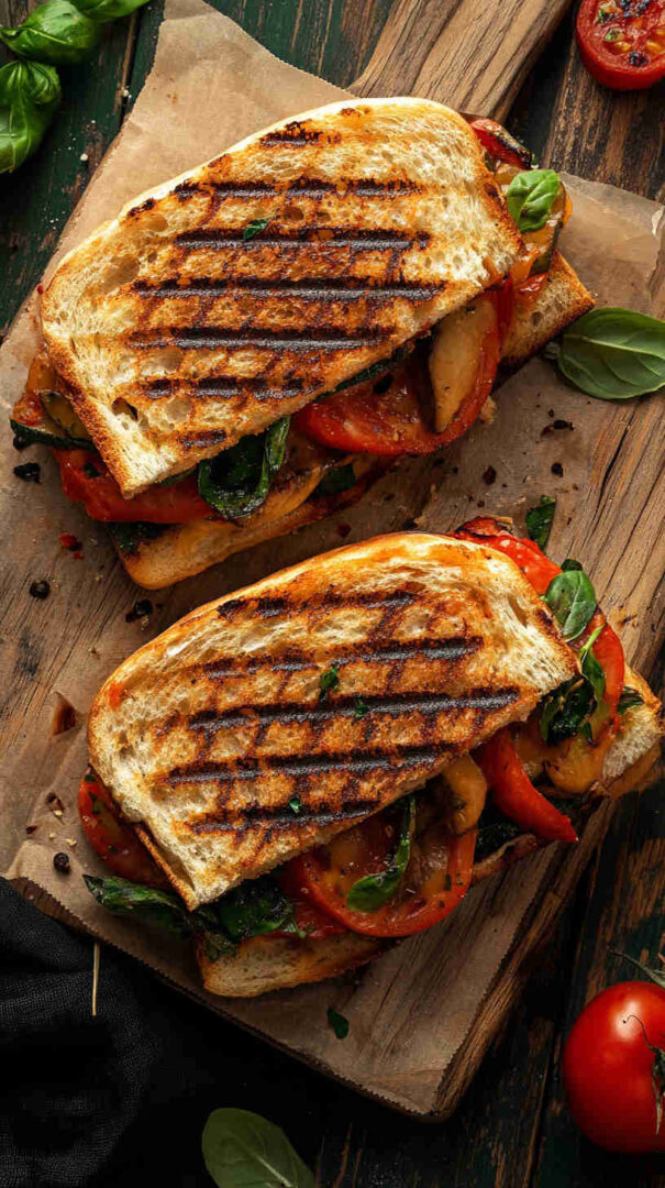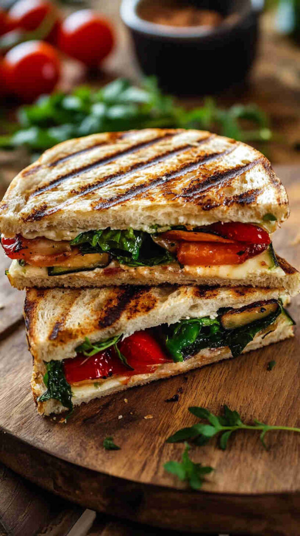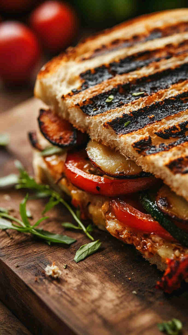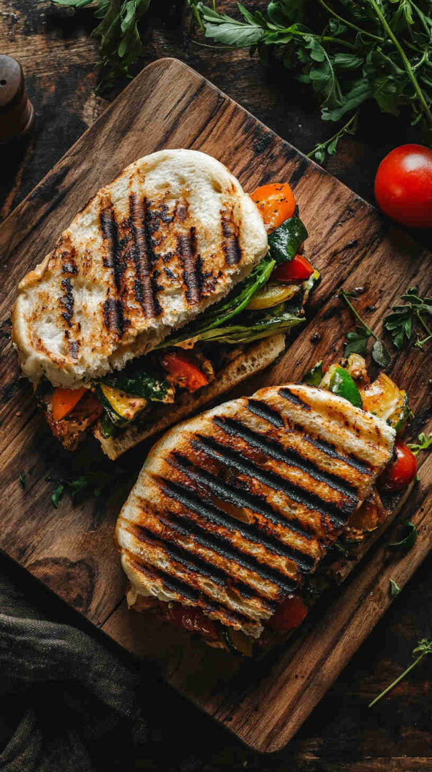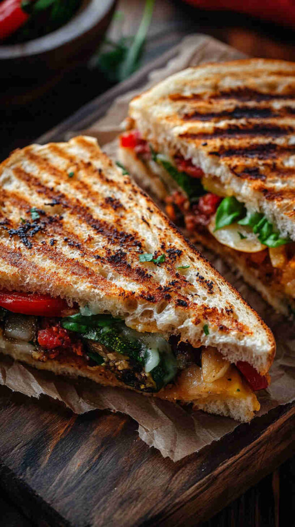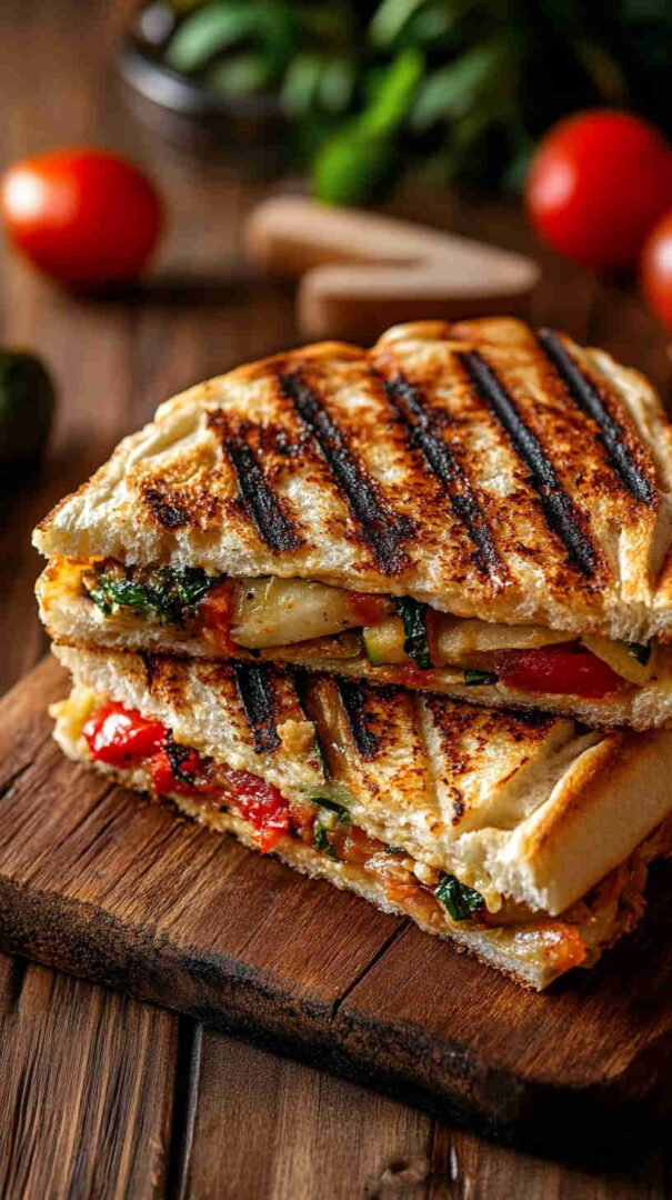 This delicious Italian Grilled Vegetable Panini layers smoky grilled zucchini, eggplant, bell peppers, and red onion with creamy fresh mozzarella, vibrant pesto, and sun-dried tomatoes, all pressed between crispy ciabatta bread until golden and melty. It’s a hearty, flavor-packed vegetarian sandwich bursting with Mediterranean sunshine in every bite.