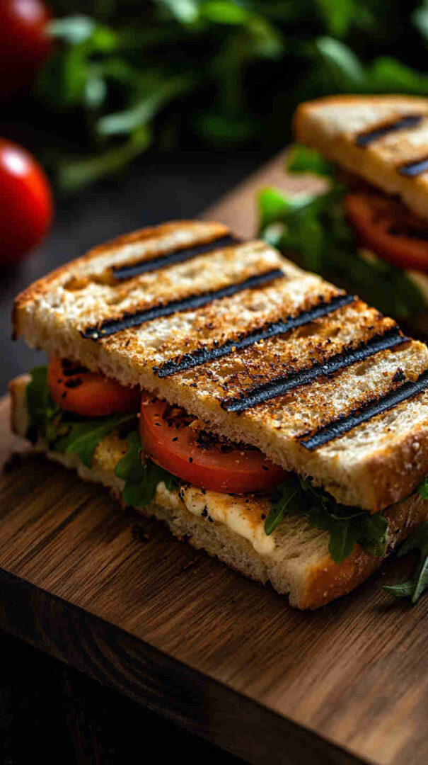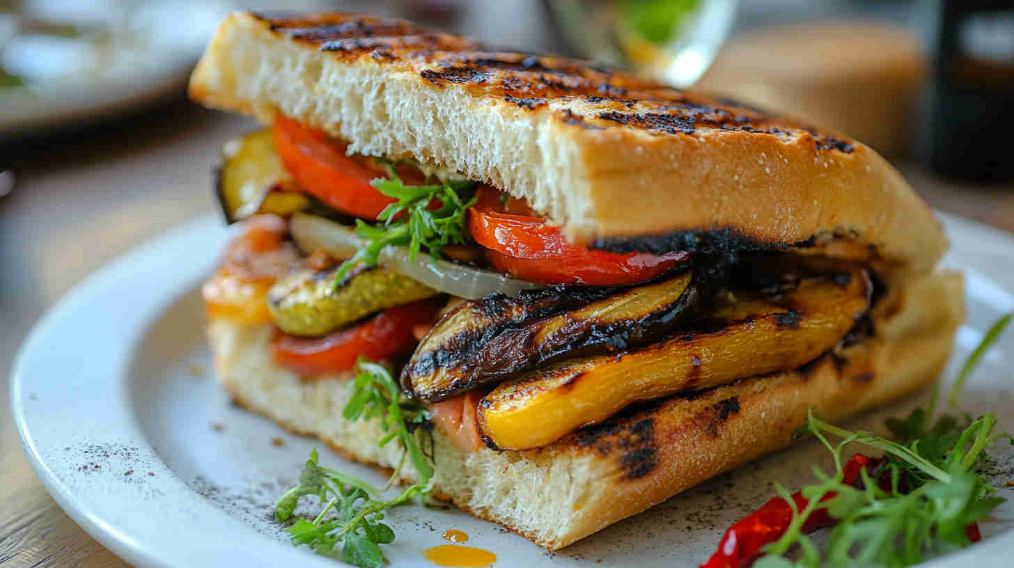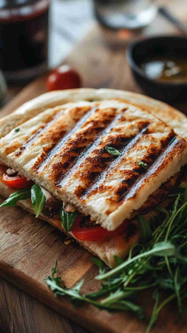 Ciabatta or focaccia rolls provide the ideal airy, crusty base that crisps beautifully when pressed. Fresh vegetables—zucchini, eggplant, bell peppers, and red onion—become sweet and smoky when grilled.
