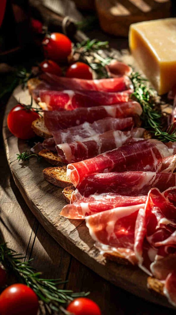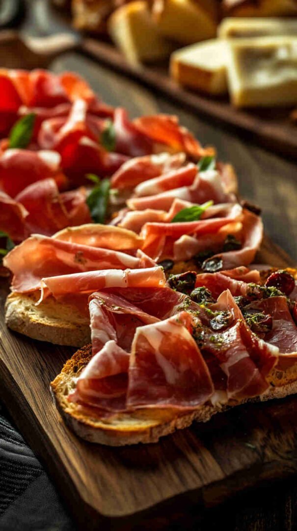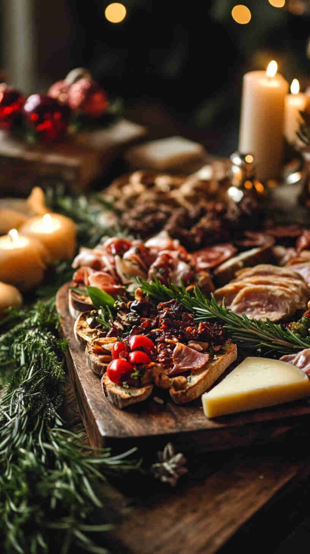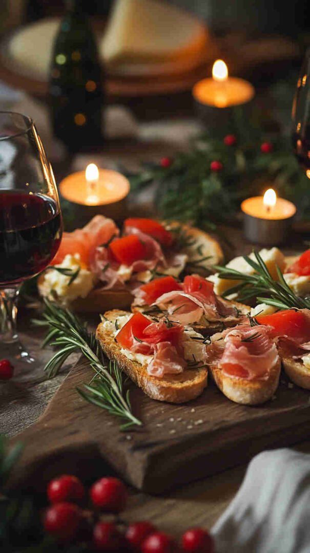 - Add the holiday sparkle — If using mozzarella, place a slice or star on some toasts now. Tear prosciutto into ribbons and drape artfully for savory elegance.