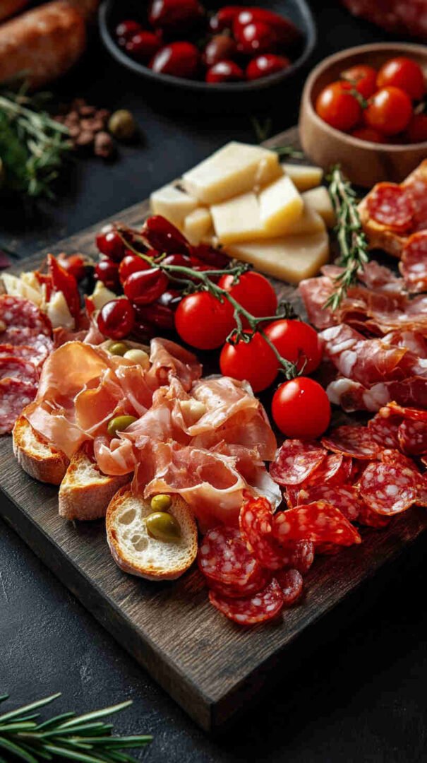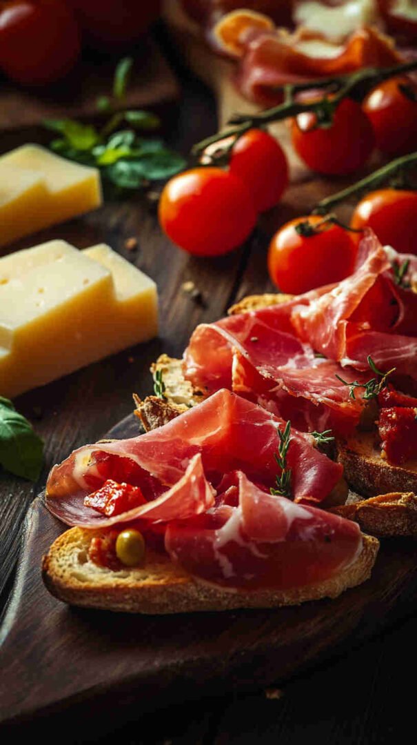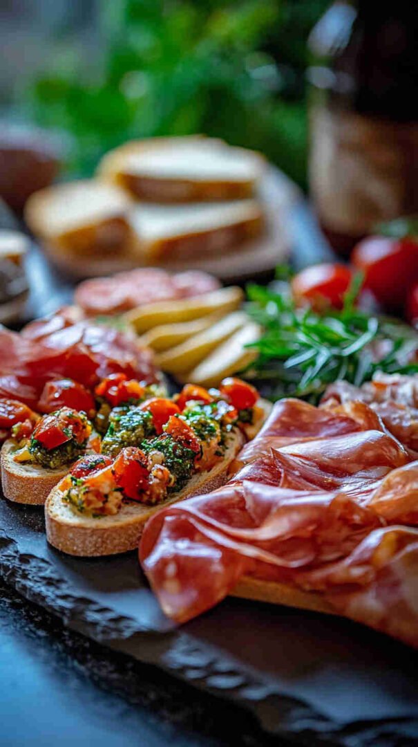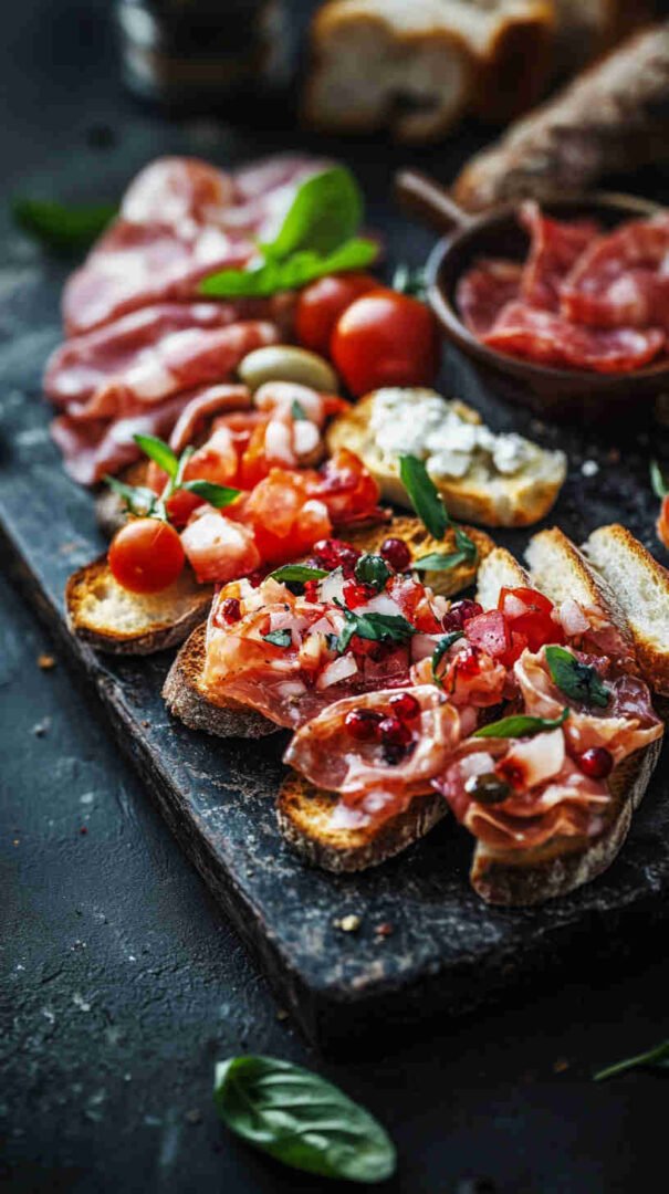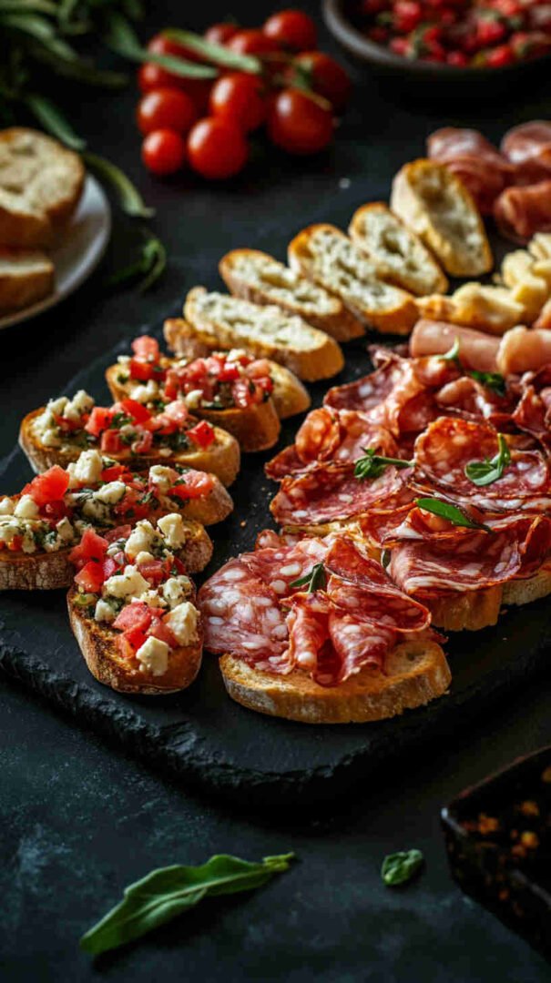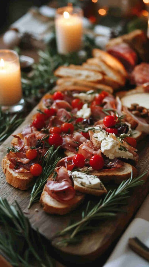 This festive Italian Holiday Bruschetta Platter features crispy toasted baguette slices topped with vibrant, fresh tomato-basil mixtures, creamy cheeses, prosciutto, and holiday-inspired accents like balsamic glaze and mozzarella stars. Perfect for Christmas or New Year’s gatherings, it’s a colorful, crowd-pleasing antipasto that brings authentic Italian flavors to your holiday table in an easy, shareable platter style.