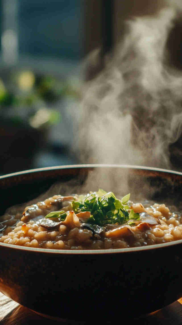 - Rest & serve – Let risotto rest 3–4 minutes off heat. Spoon into warm bowls, top with reserved mushrooms, a sprinkle of fresh herbs, extra black pepper, and a little more parmesan if desired. Enjoy immediately while it’s hot and creamy!