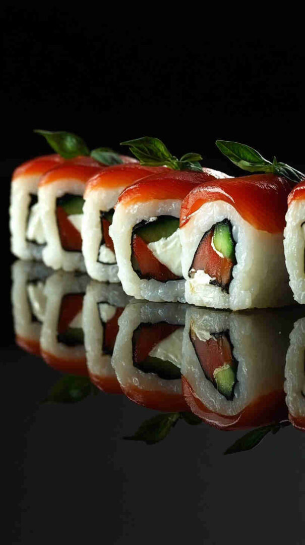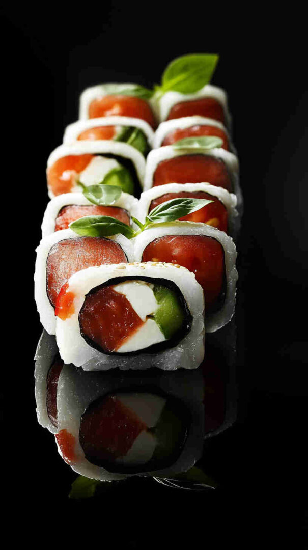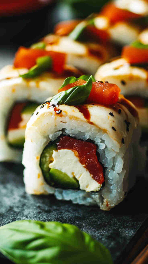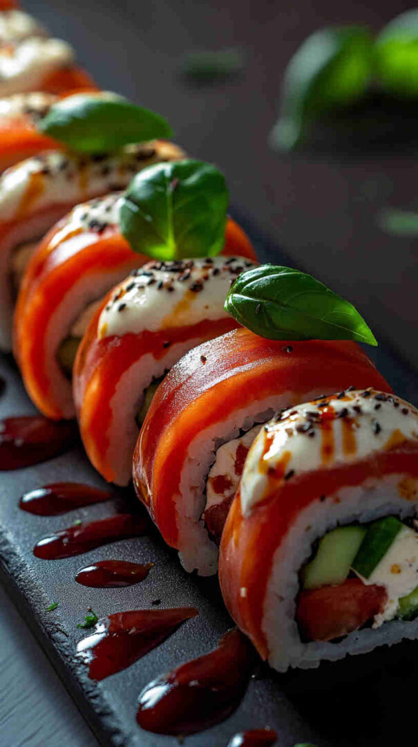 Fresh Caprese flavors wrapped sushi-style — creamy mozzarella, tomato, basil, rice, balsamic drizzle. Elegant Italian-Japanese fusion appetizer.