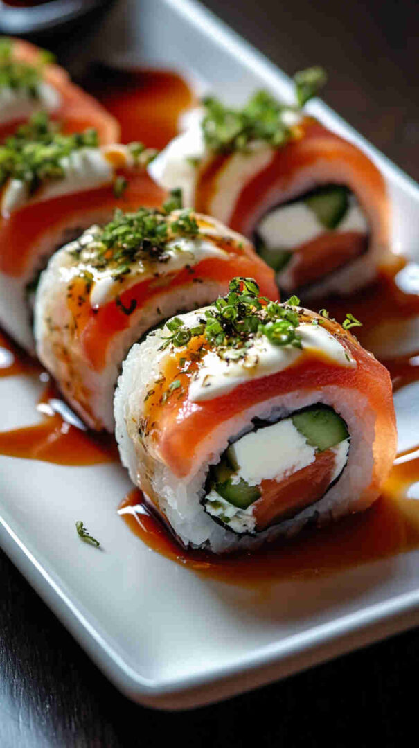 These stunning Caprese rolls blend creamy fresh mozzarella, juicy tomatoes, fragrant basil, and perfectly seasoned sushi rice, all wrapped in nori or soy paper. Finished with a balsamic glaze drizzle, they offer an irresistible Italian-Japanese fusion — light, elegant, no raw fish, and perfect as an appetizer or party bite.