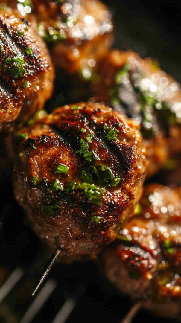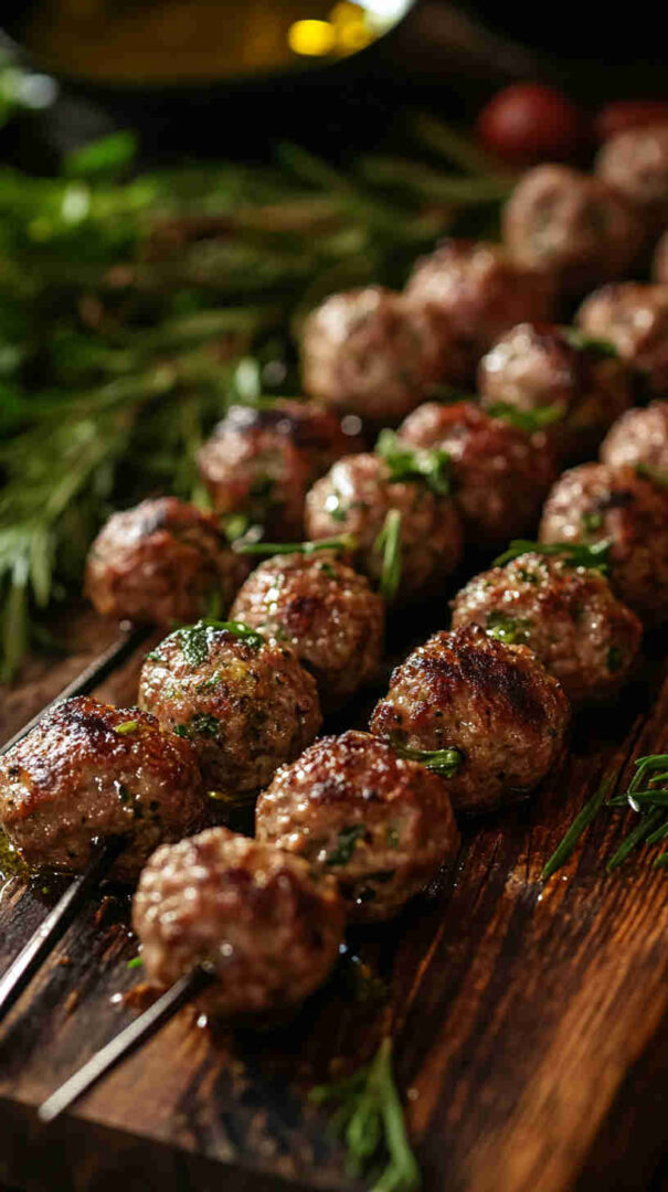 - Grill time! — Place skewers on the hot grill. Cook 12–15 minutes total, turning every 3–4 minutes for even charring and beautiful grill marks. Meatballs should reach 160°F (71°C) inside.
