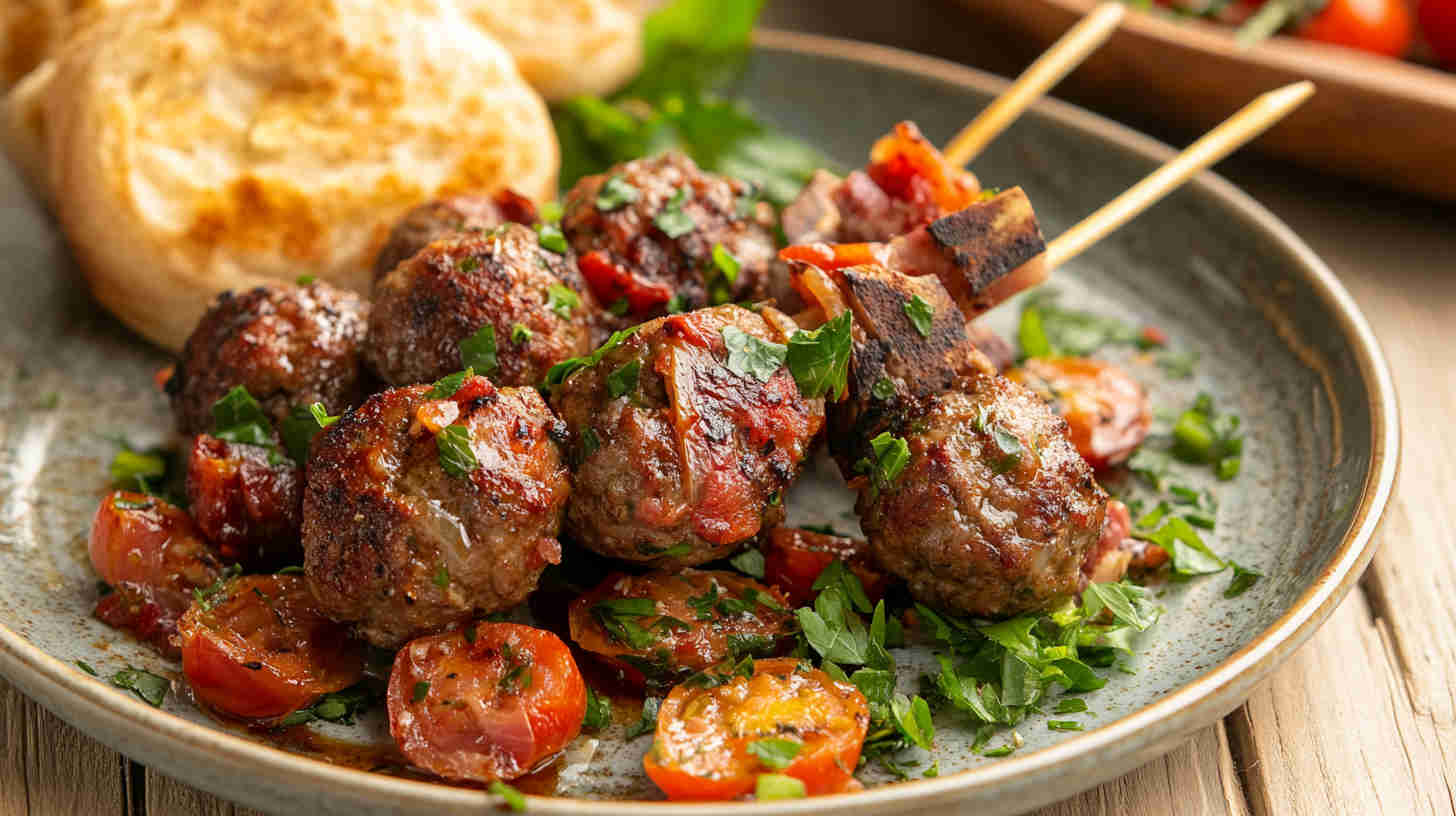Juicy Italian-seasoned lamb meatballs grilled on skewers with veggies — a fresh, flavorful Mediterranean-Italian fusion delight.