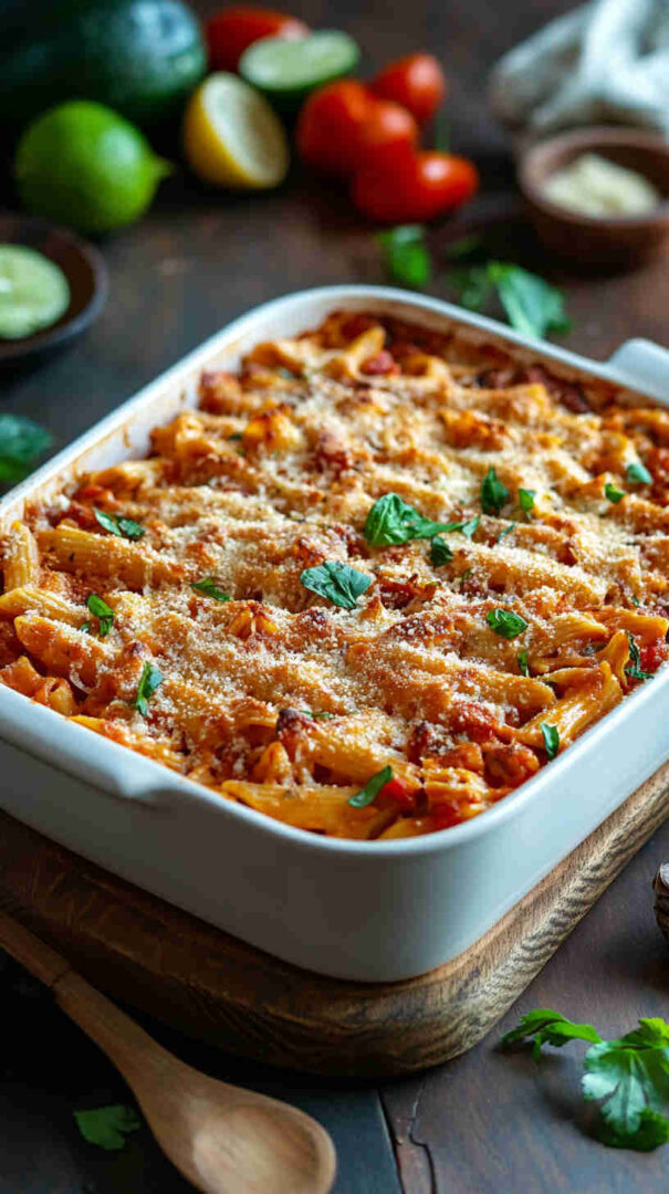Cheesy, spicy Italian-Mexican pasta bake fusing quesadilla vibes with hearty baked pasta perfection. (18 words)